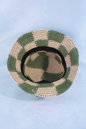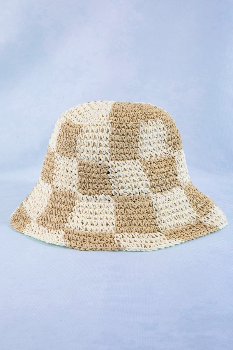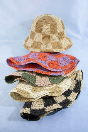 - This bucket hat features a fashionable straw braided checkered style. Discover the perfect balance of subtlety and flair as this bucket hat effortlessly completes your look.