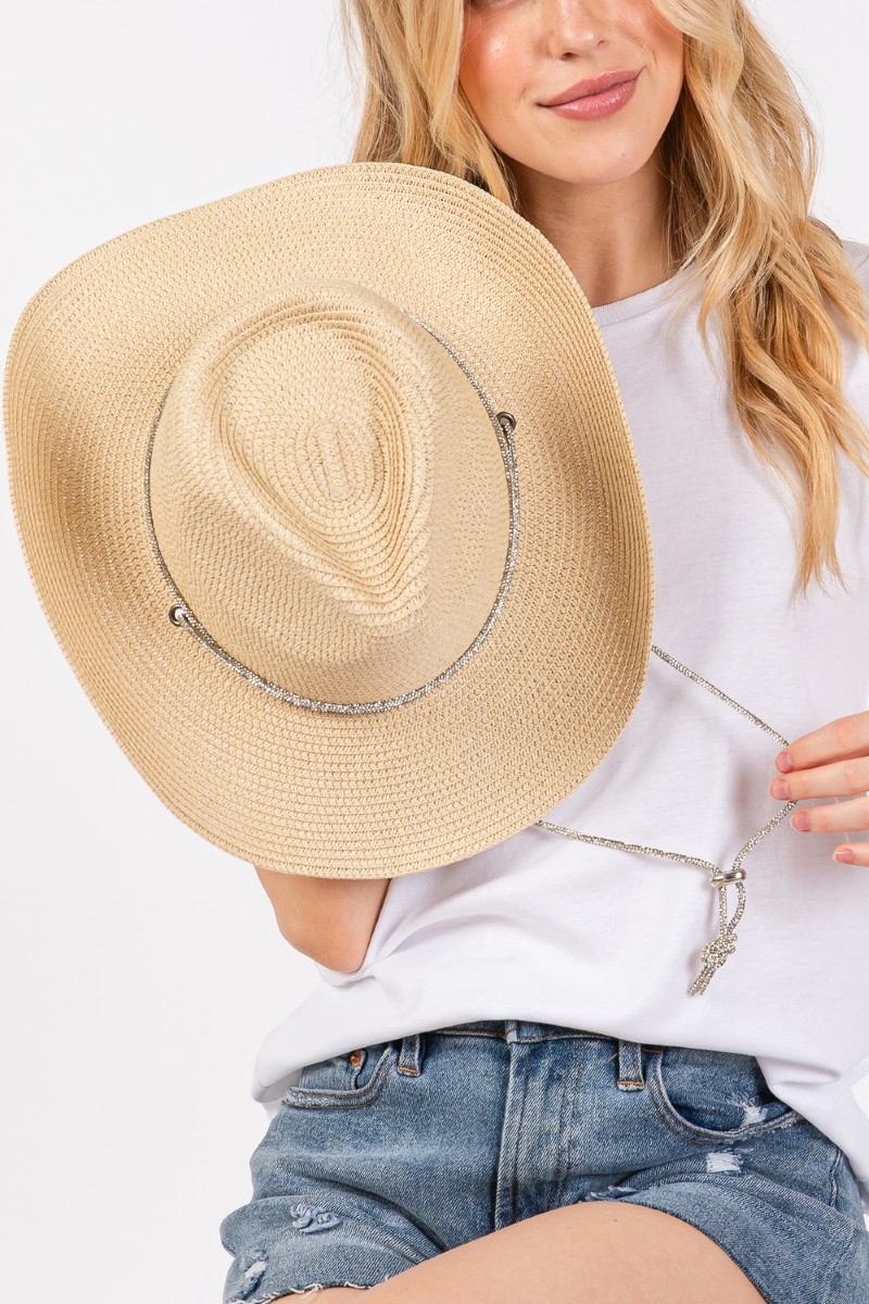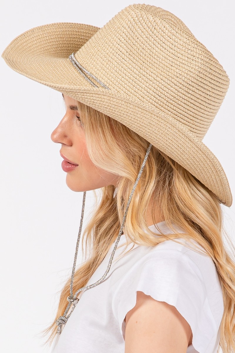 • This sun hat displays a vibrant chin strap cowboy straw style. Savor the allure of detailed craftsmanship in this exquisite sun hat.