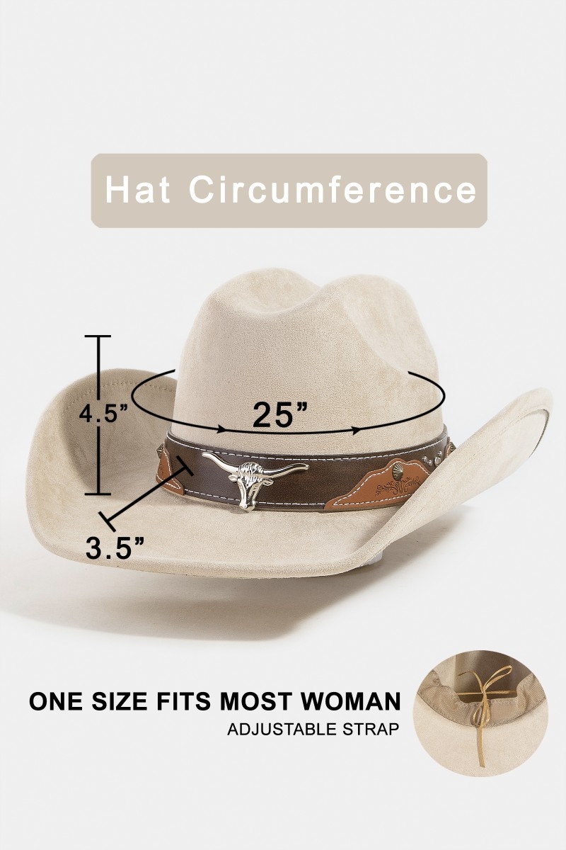 - This cowboy hat adds a modern western long horn faux leather strap style. Indulge in the allure of exquisite craftsmanship as this cowboy hat effortlessly adds a touch of luxury to your attire.