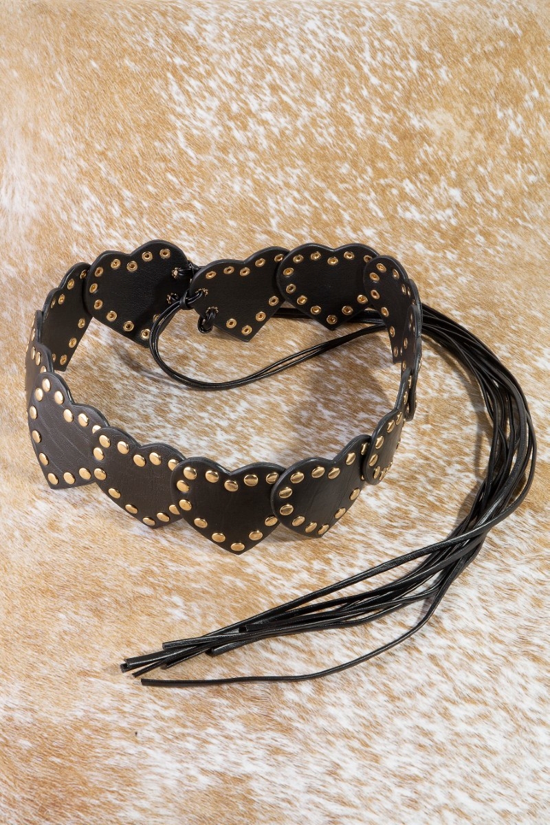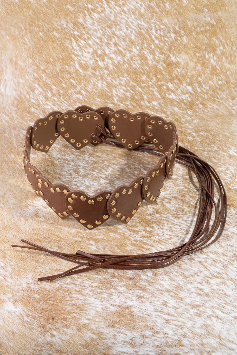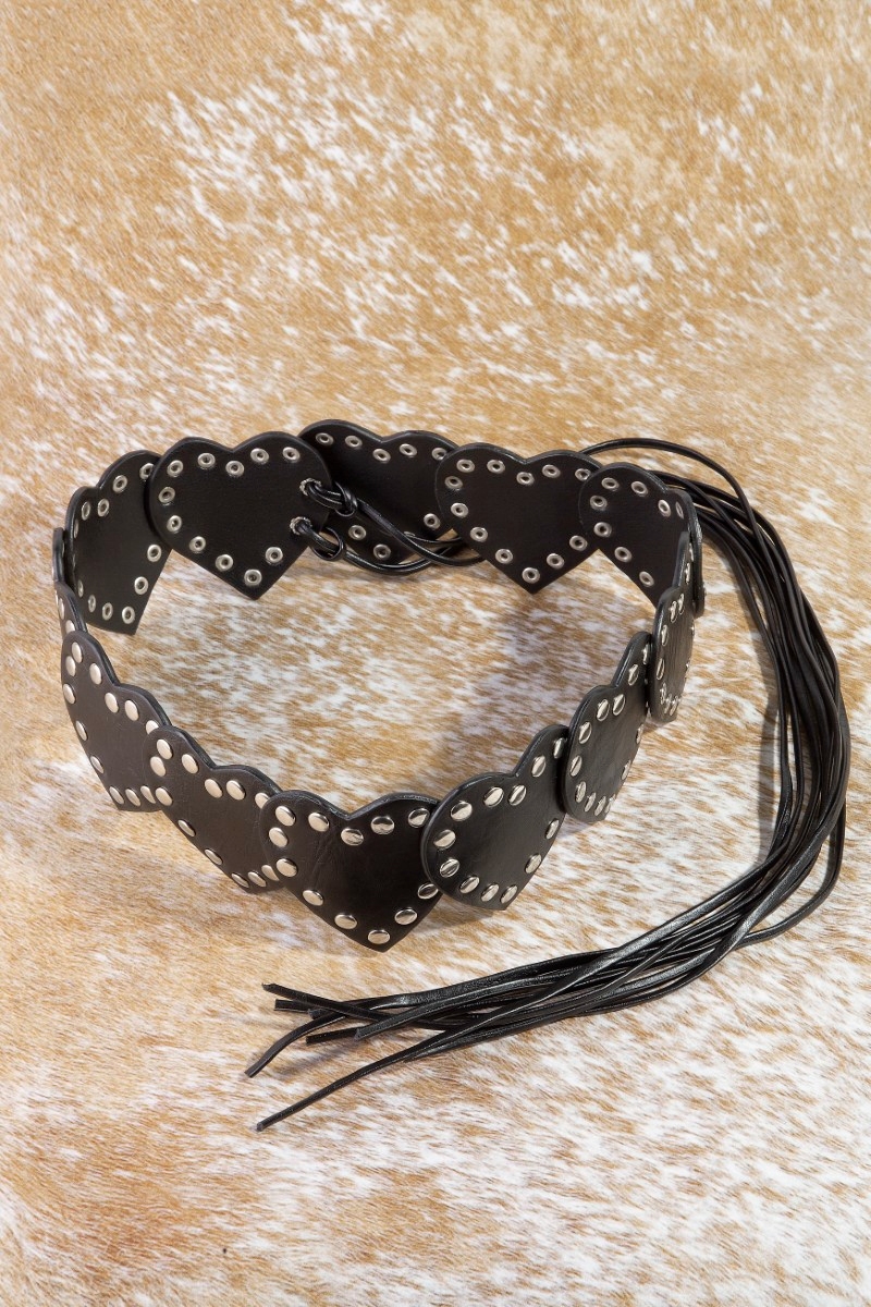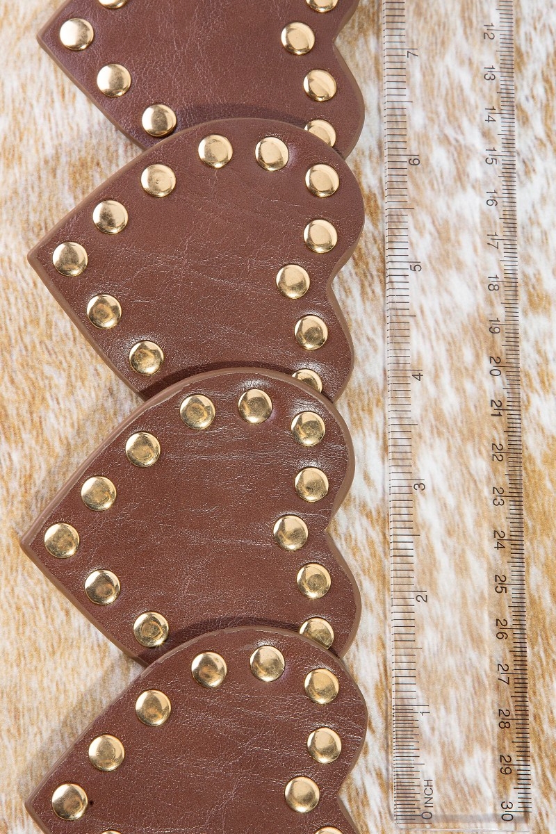 - This belt features a fashionable leather heart studded trim style. Explore a refined sense of style with this belt, seamlessly elevating the chic factor of your look.