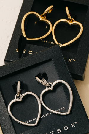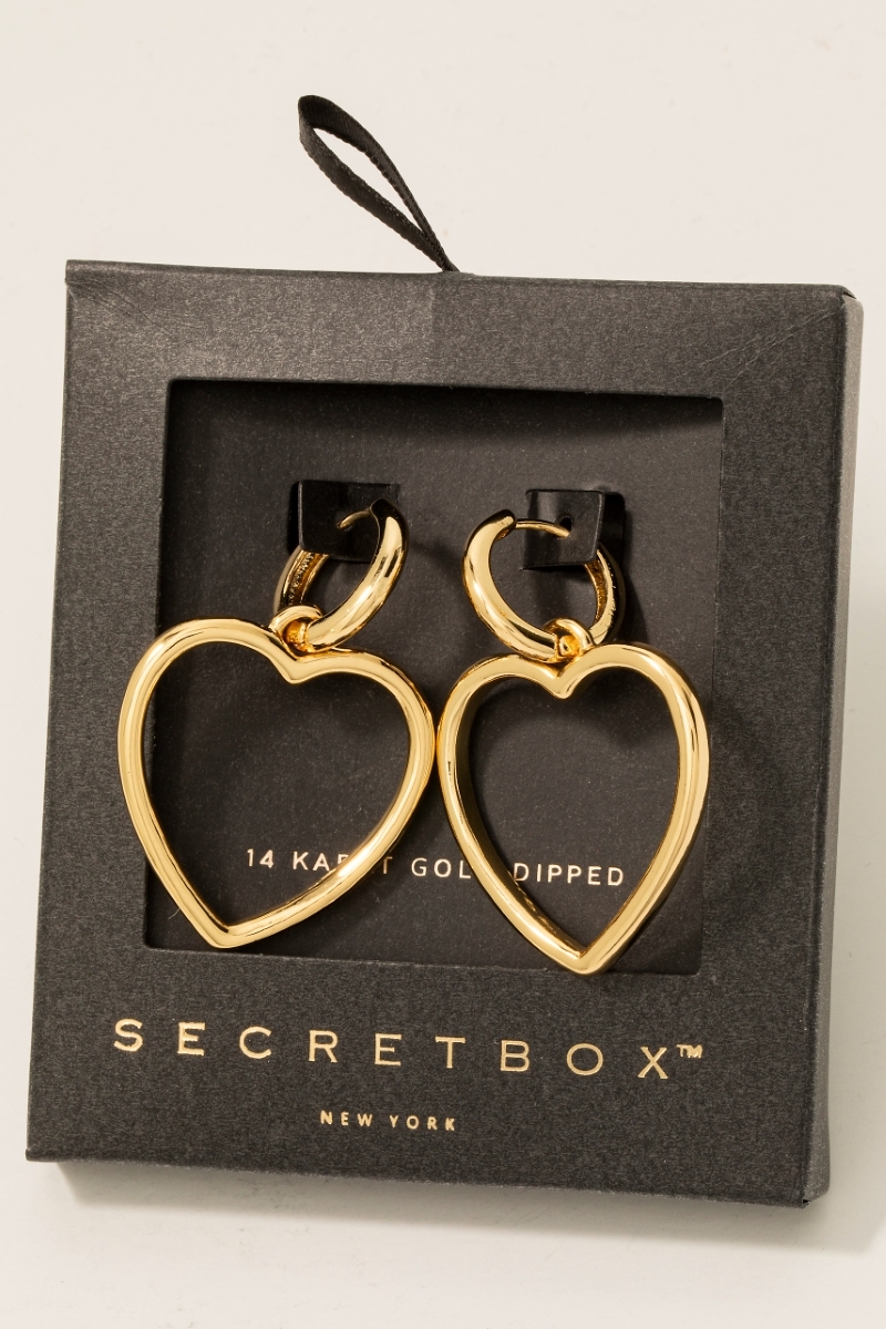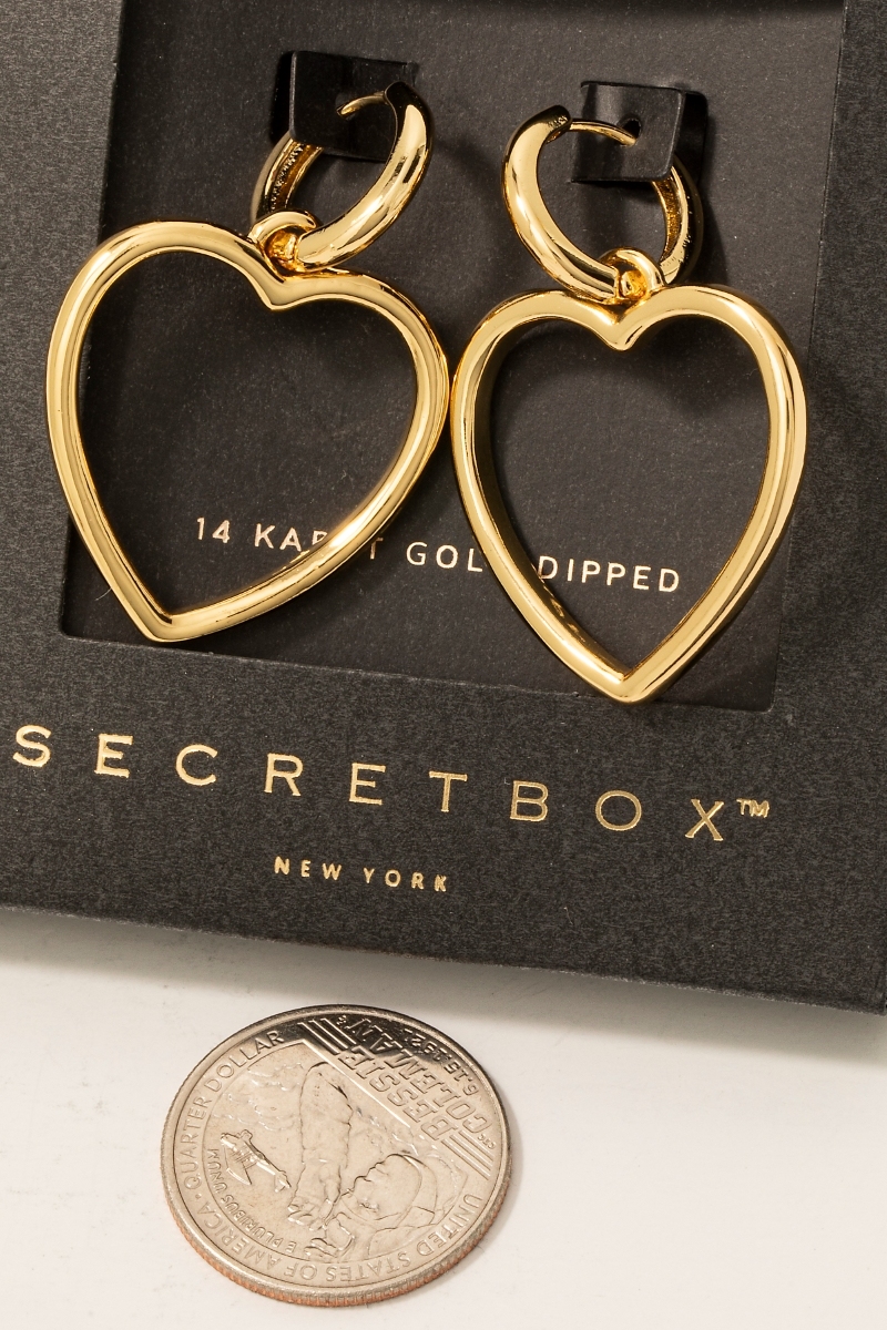 - This pair of hoop earrings displays a vibrant gold dipped large heart charm style. Revel in the intricate design that effortlessly distinguishes this pair of hoop earrings, making it a statement piece.