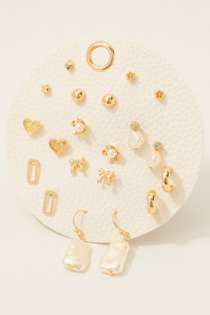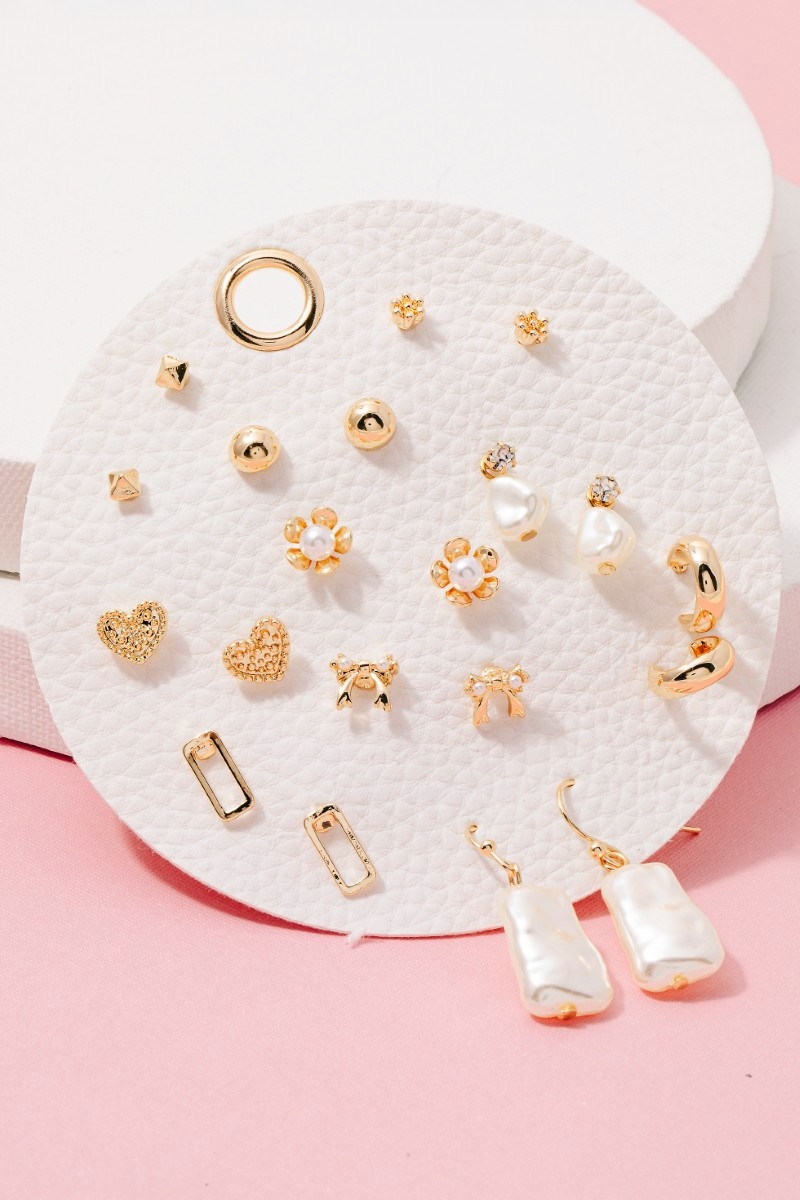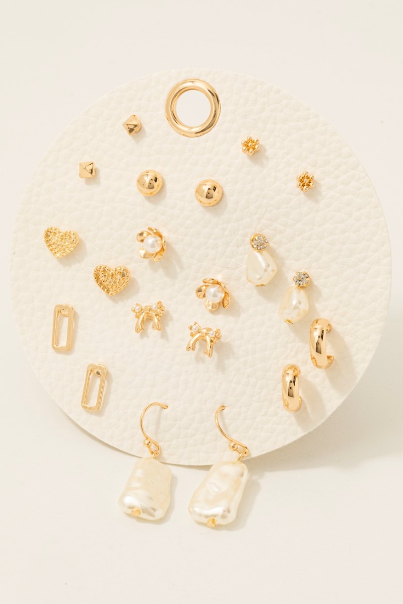 • This pair of stud earrings brings a luxurious mixed pearl and hearts 10 pair set style. Delight in the intricate details that make this pair of stud earrings an essential element in expressing your fashion identity.