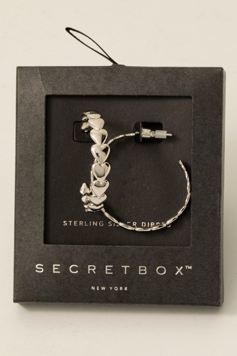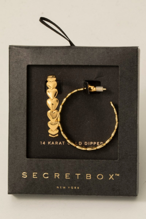 • This pair of hoop earrings brings a luxurious secret box gold dipped solid heart link style. Unveil a new dimension of sophistication as this pair of hoop earrings effortlessly enhances the elegance of your ensemble.