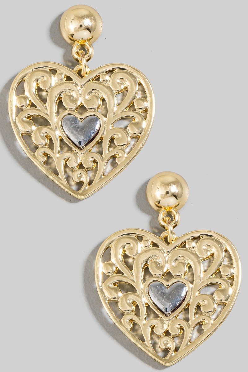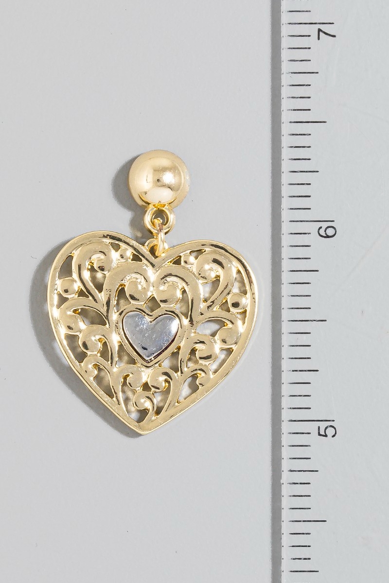 • This pair of stud earrings introduces a stunning two tone filigree heart charm style. Experience refined sophistication with this understated yet stylish piece.