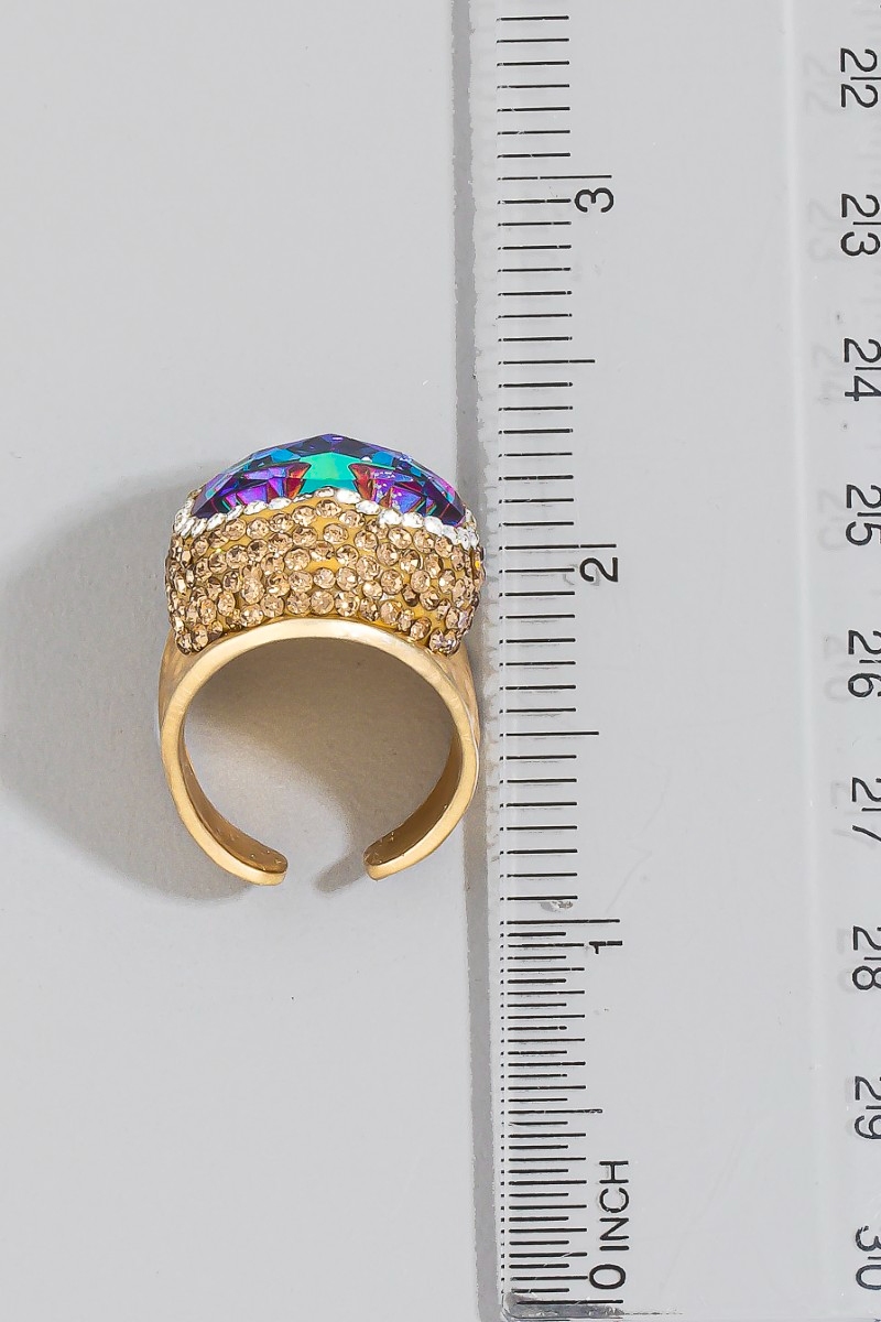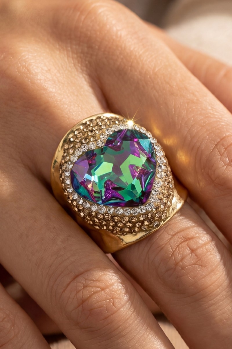 • This ring brings a unique faceted crystal heart pave statement style. Indulge in the allure of exquisite craftsmanship as this ring effortlessly adds a touch of luxury to your attire.