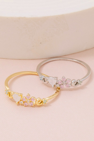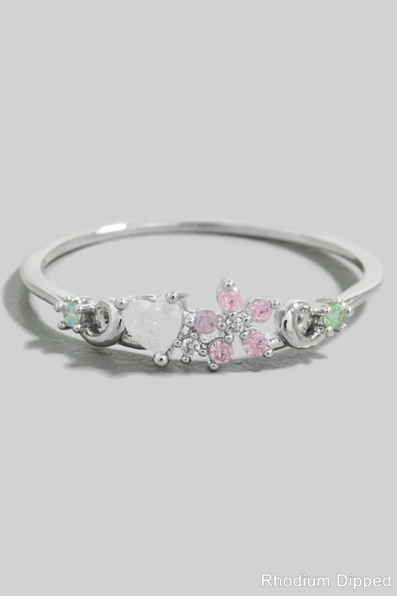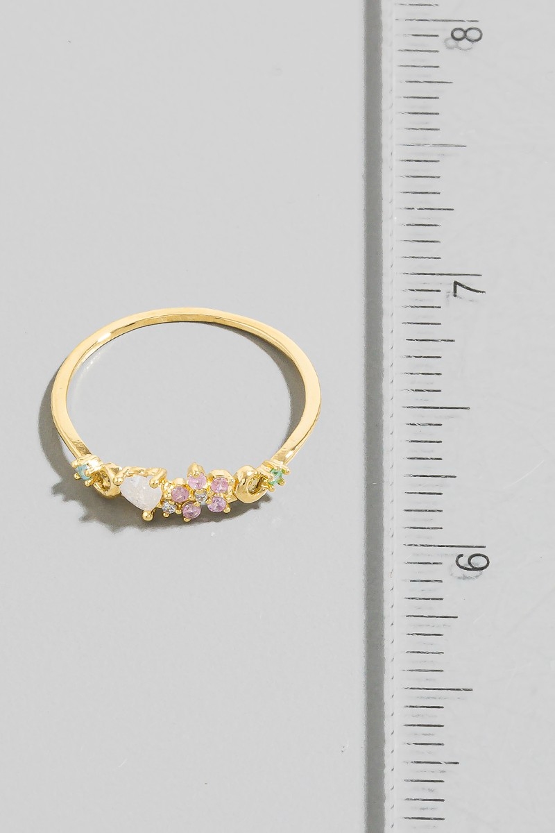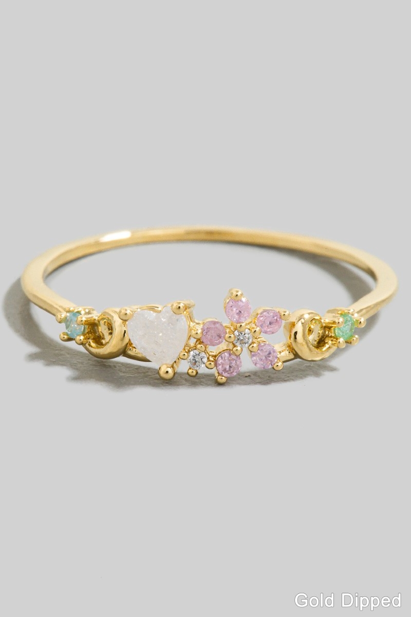 • This ring adds a modern gold dipped flower heart cubic zirconia style. Celebrate the art of accessorizing with this piece that effortlessly encapsulates modern trends.