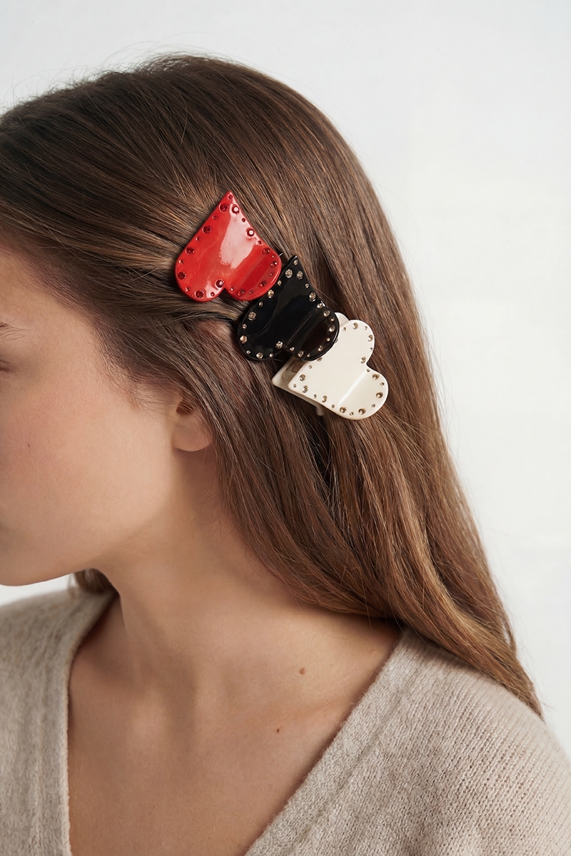 - This hair clip brings a unique three piece heart jaw set style. Revel in the intricate design that effortlessly distinguishes this hair clip, making it a statement piece.