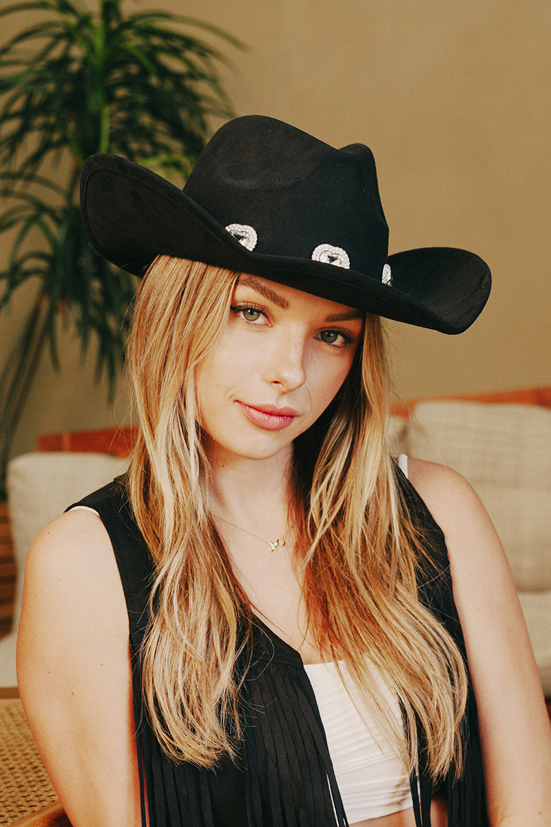 • This cowboy hat adds a modern large rhinestone pave heart style. Delight in the nuanced details that make this cowboy hat a testament to fine design and impeccable taste.