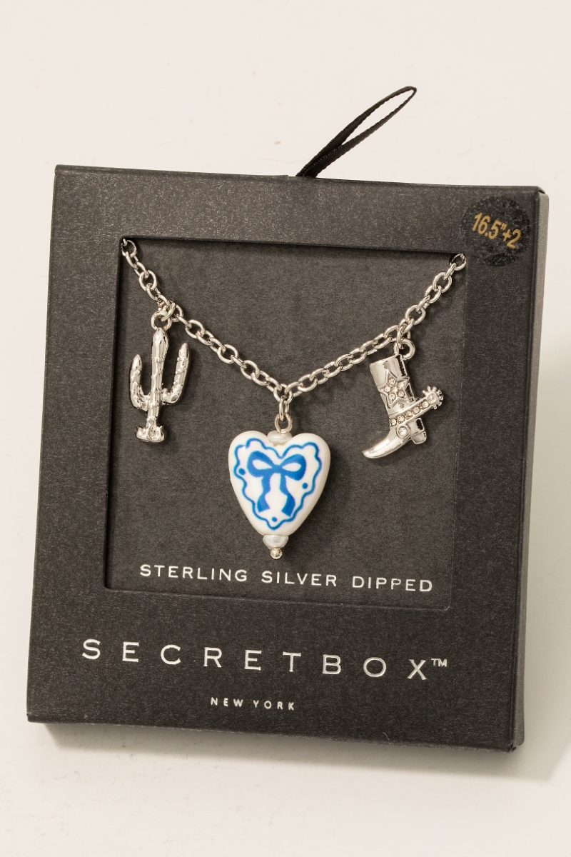 • This chain necklace introduces a unique gold dipped ceramic bow heart western charms style. Savor the allure of detailed craftsmanship in this exquisite chain necklace.