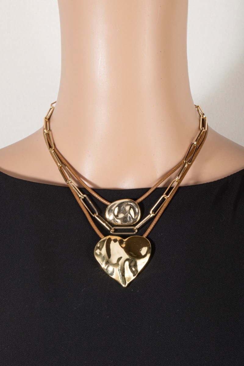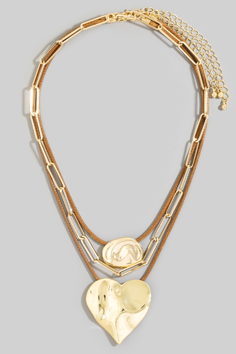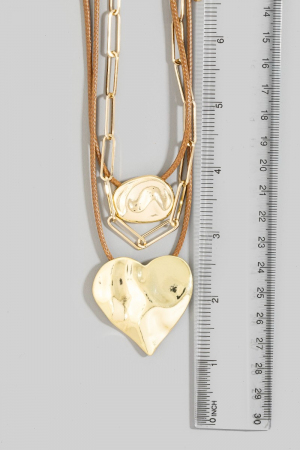 • This necklace brings a stunning three layered large heart pendant style. Experience a subtle blend of modernity and classic charm as this necklace effortlessly adorns your ensemble.