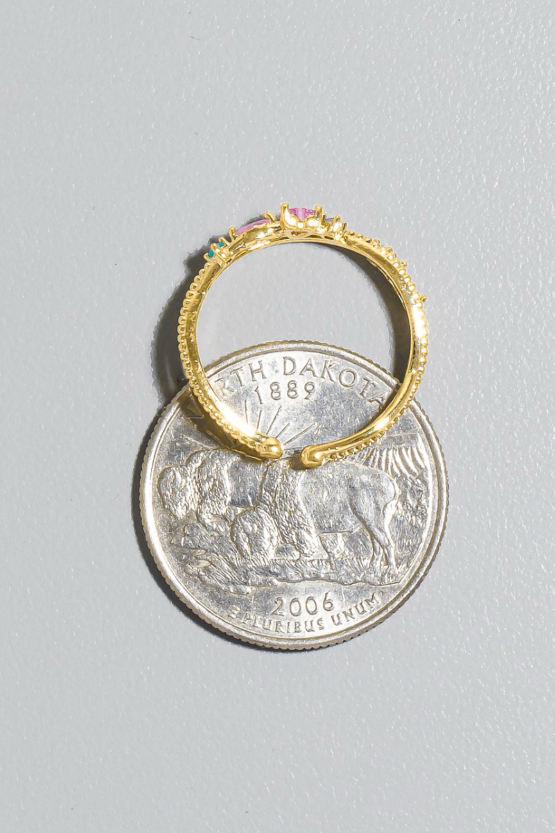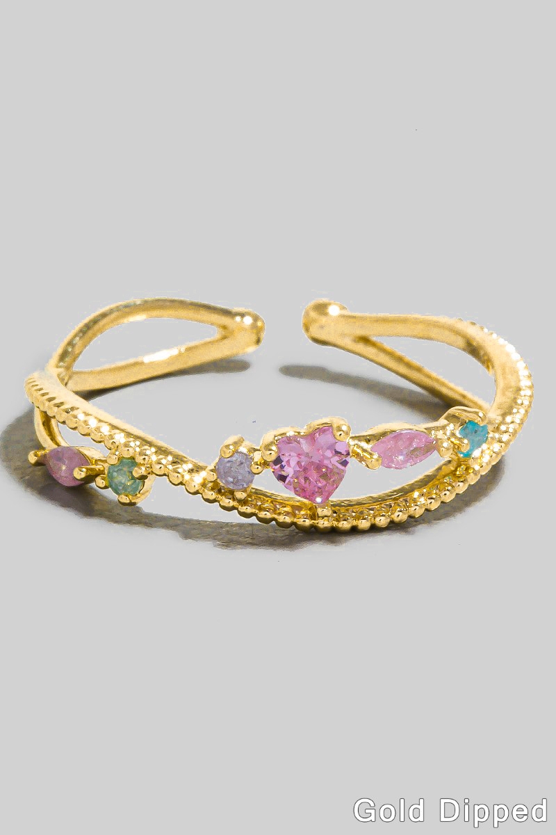 - This ring brings a unique gold dipped mixed cubic zirconia hearts layered open band style. Elevate your ensemble with this chic, timeless ring.