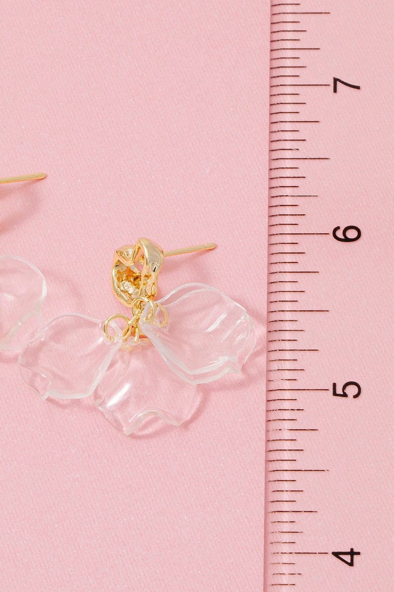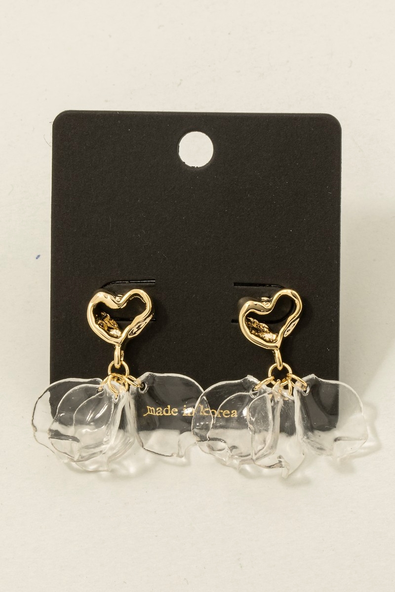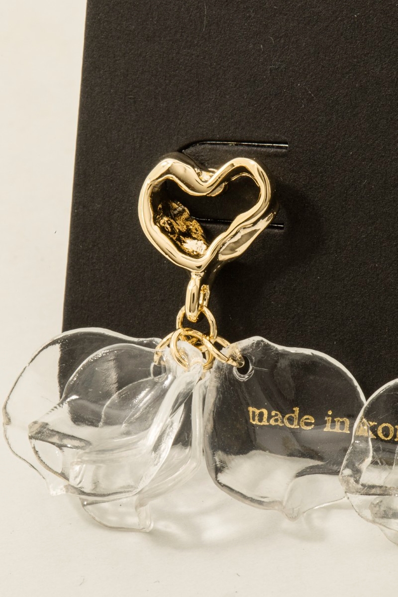 - This pair of dangle earrings features a fashionable warped heart and clear petals style. Discover the perfect balance of subtlety and flair as this pair of dangle earrings effortlessly completes your look.