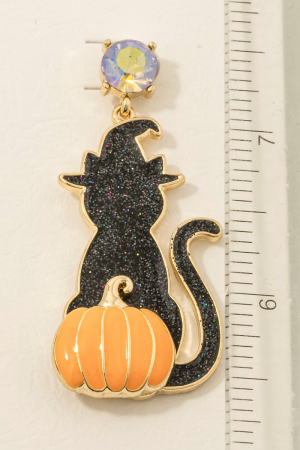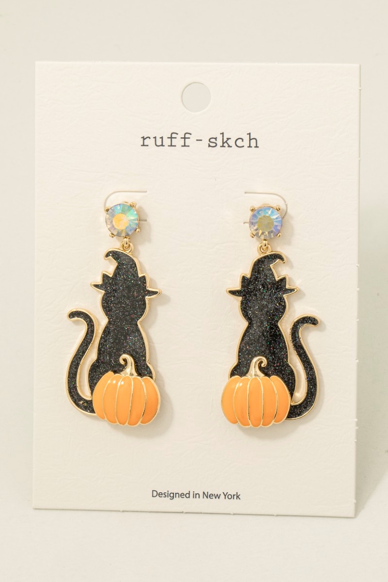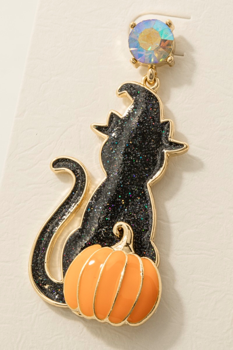 - This pair of dangle earrings brings a luxurious halloween glitter witch cat pumpkin style. Experience the joy of accessorizing with this piece that effortlessly combines versatility and charm.