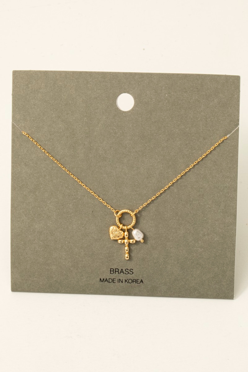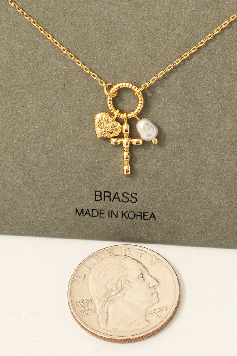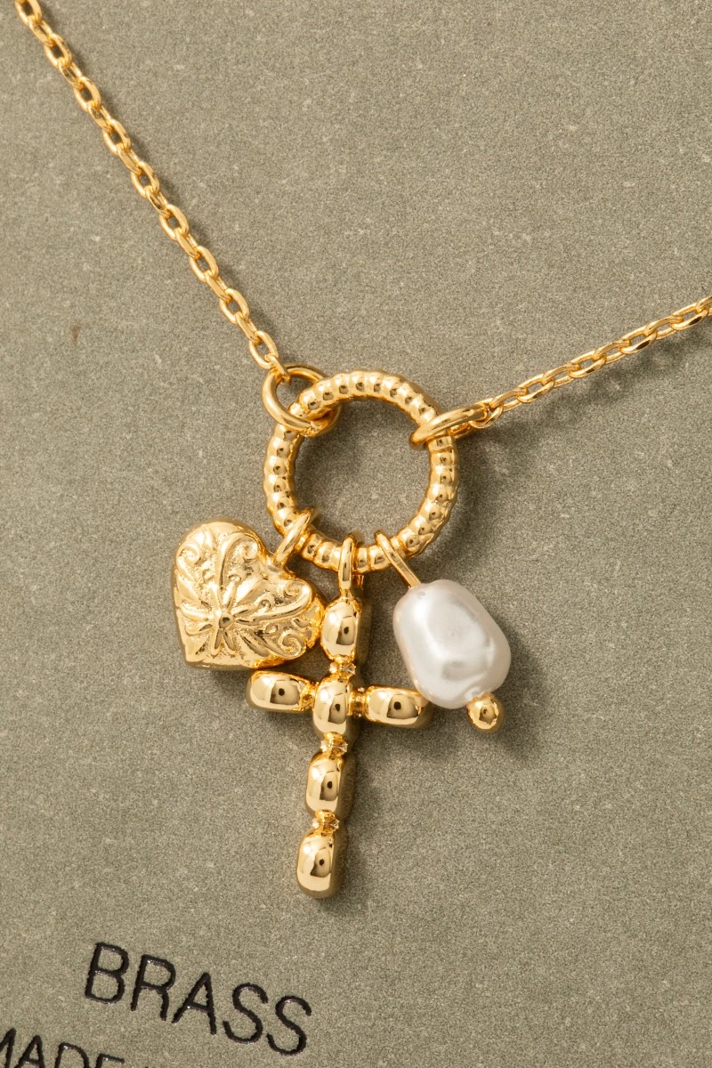 • This chain necklace features a fashionable heart cross and pearl charms style. Elevate your ensemble with this chain necklace that effortlessly captures the essence of refined fashion.