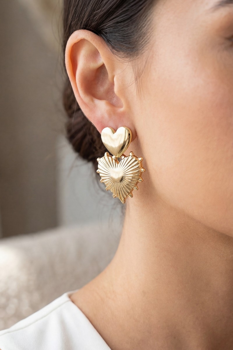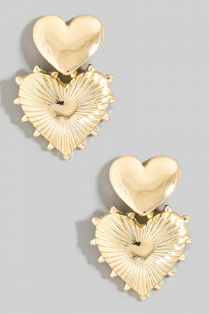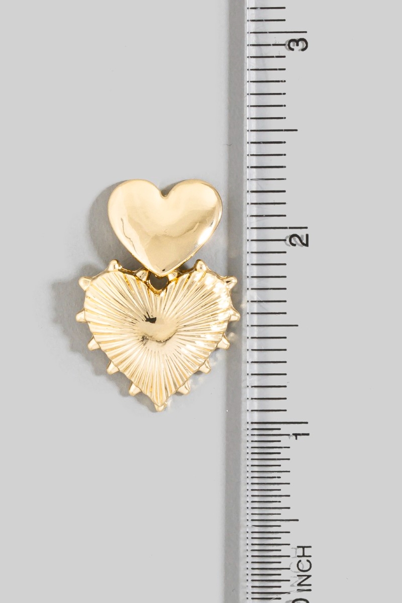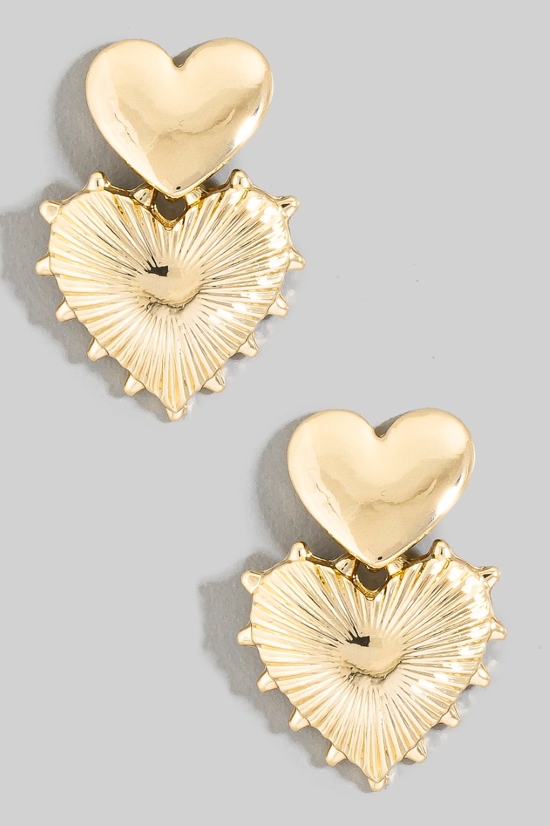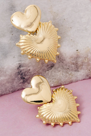 - This pair of drop earrings introduces a stunning metallic double layered heart style. Delight in the intricate details that make this pair of drop earrings an essential element in expressing your fashion identity.