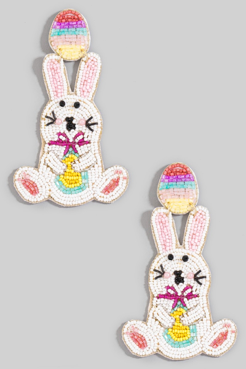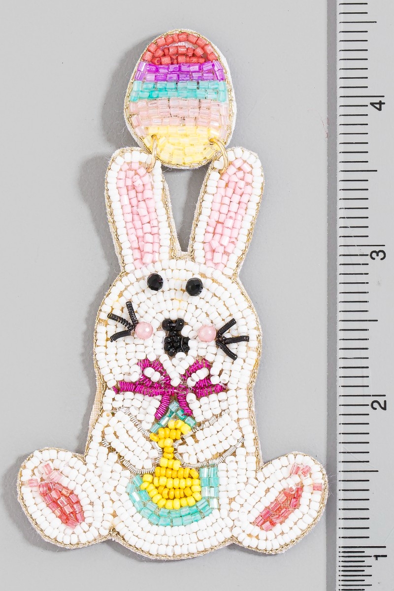 - This pair of dangle earrings displays a vibrant seed beaded easter bunner and egg stud style. Experience a subtle blend of modernity and classic charm as this pair of dangle earrings effortlessly adorns your ensemble.