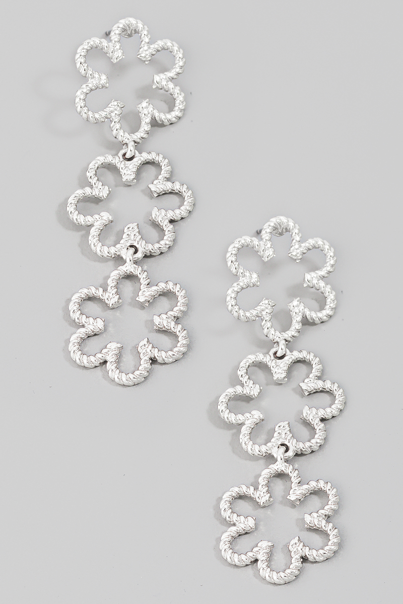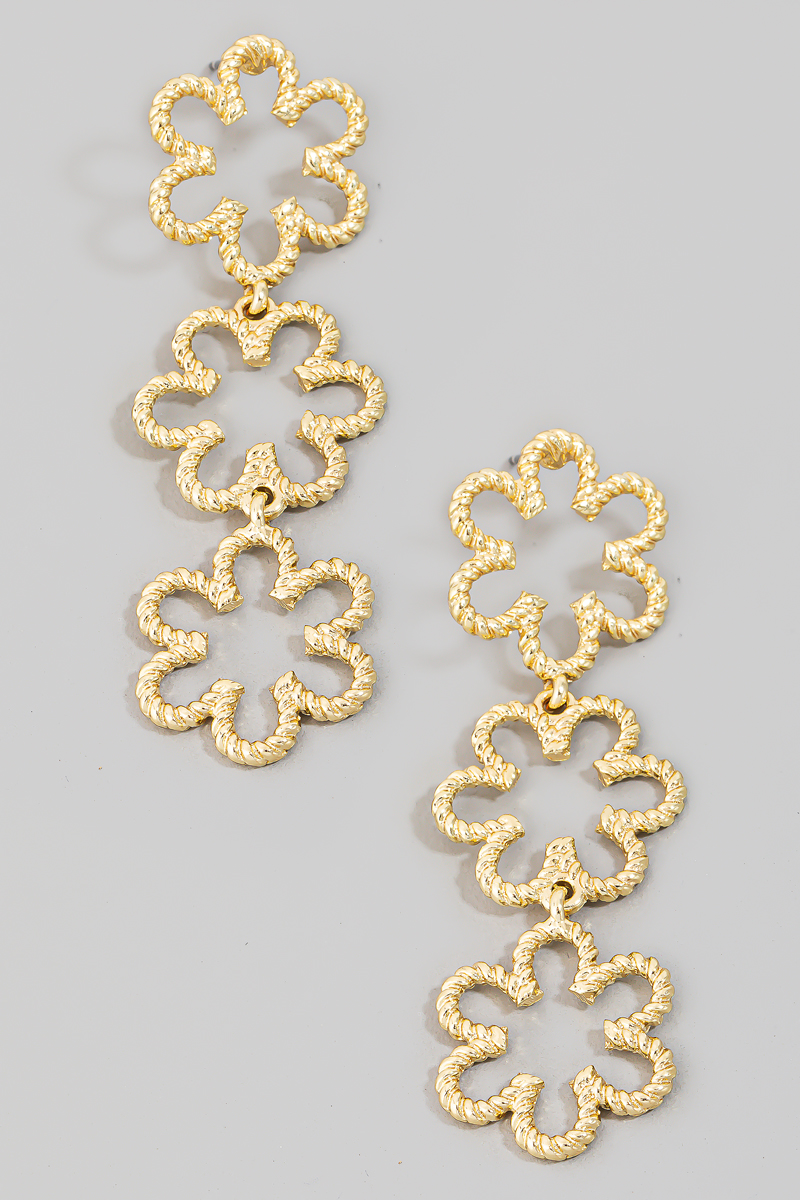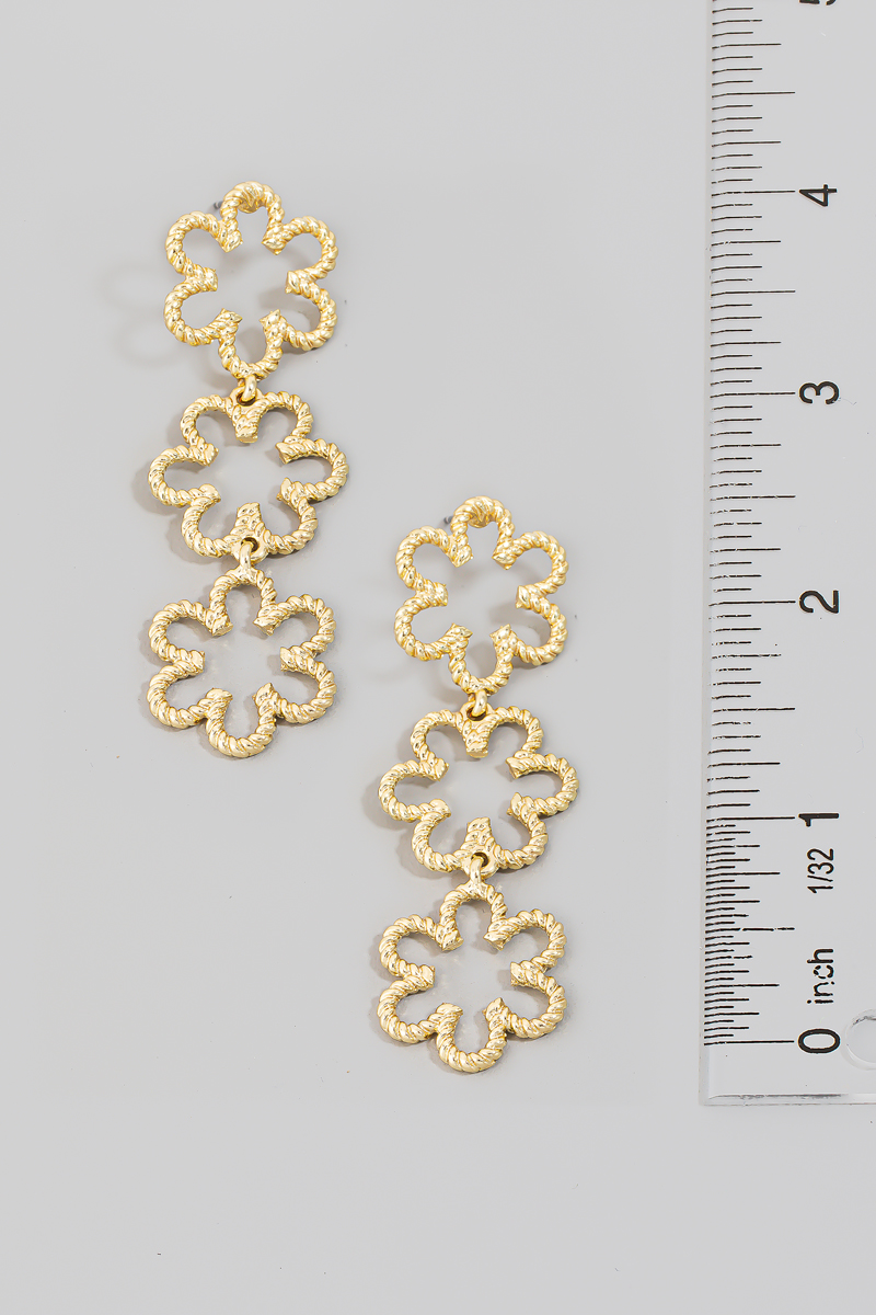 • This pair of drop earrings displays a fashionable triple flower style. Elevate your ensemble with this chic, timeless accessory.