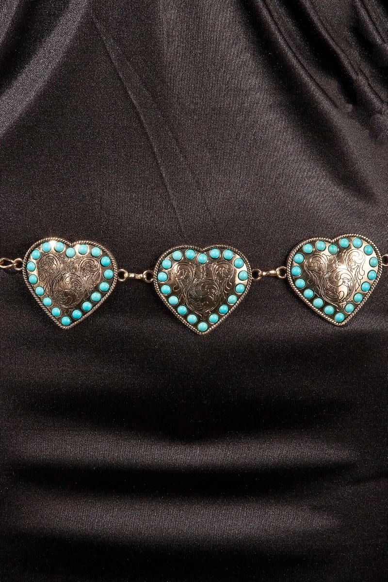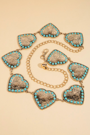 - This chain belt brings a luxurious turquoise studded hearts style. Revel in the intricate design that effortlessly distinguishes this chain belt, making it a statement piece.
