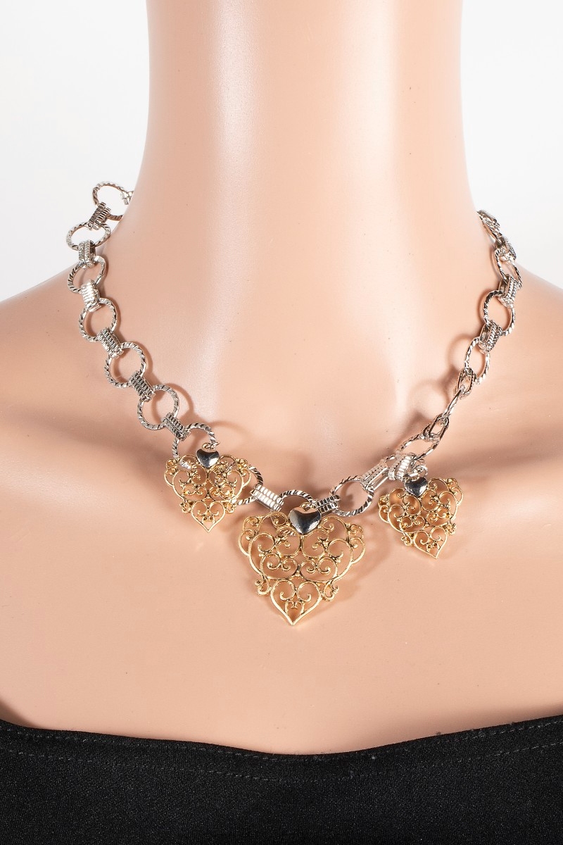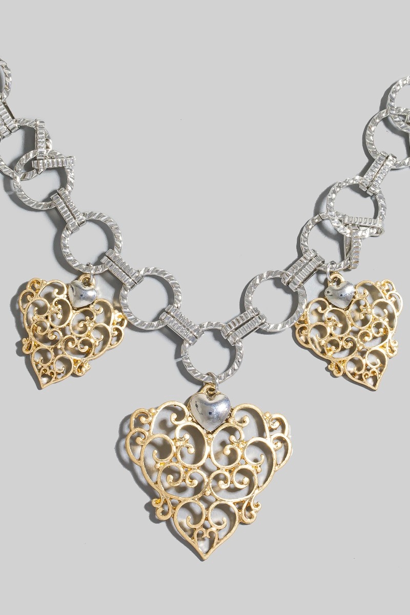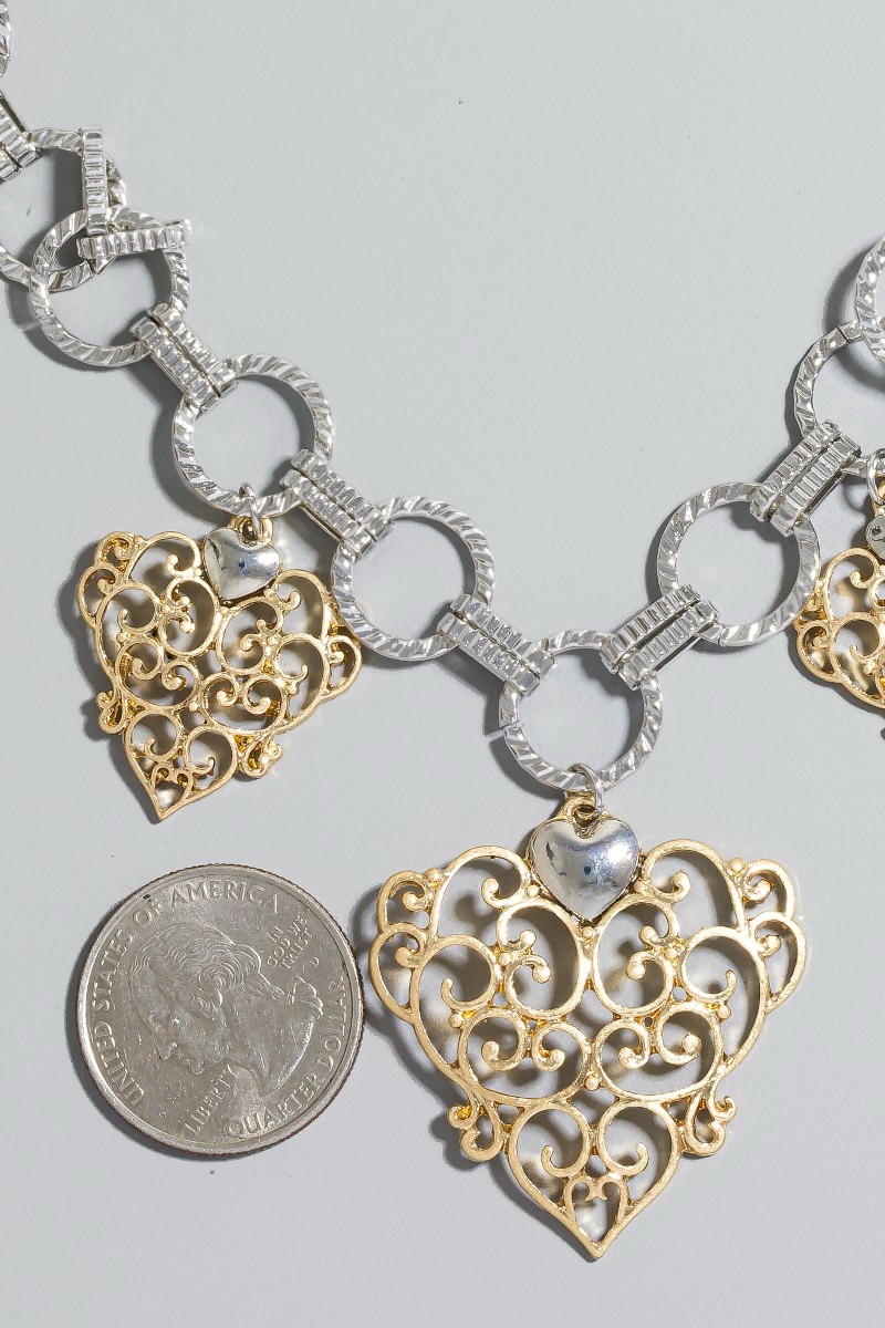 • This necklace brings a unique two tone chain and filigree hearts charms style. Elevate your ensemble with this chic, timeless necklace.
