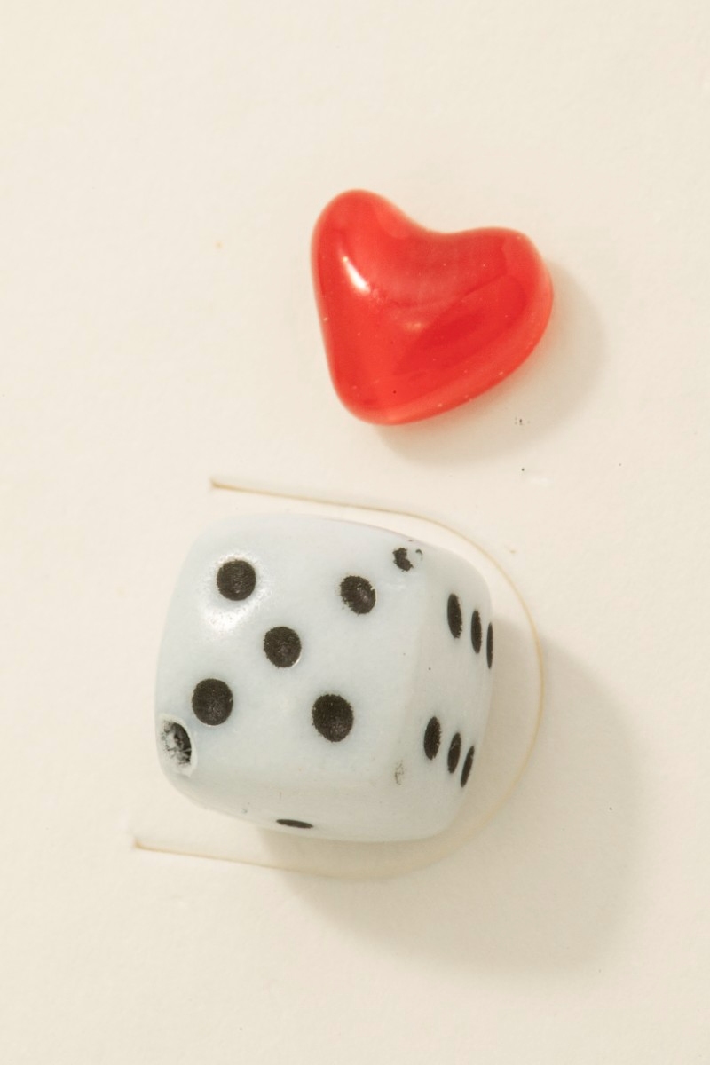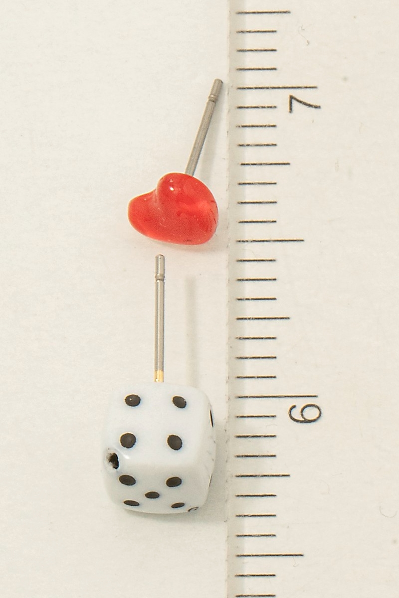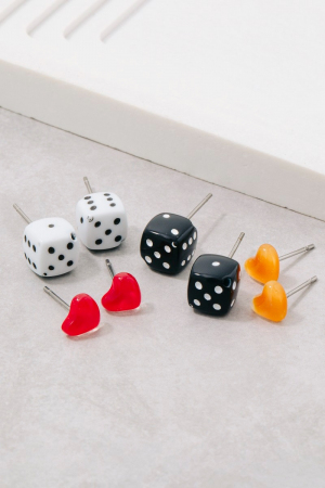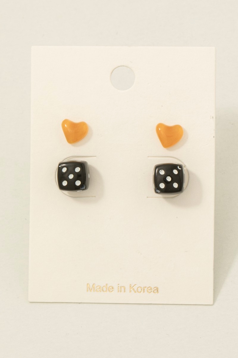 - This pair of stud earrings showcases a timeless dice and hearts acrylic set style. Unveil modern elegance with this subtly intricate pair of stud earrings.