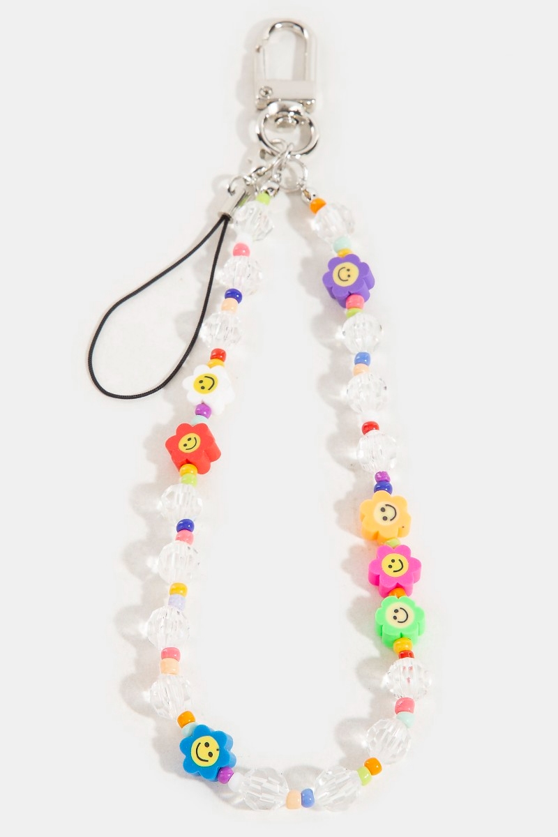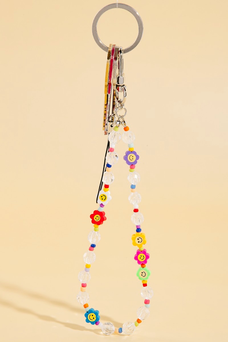 - This bag brings a unique happy flower beads key ring keychain style. Indulge in the artistry of accessorizing with this unique piece.