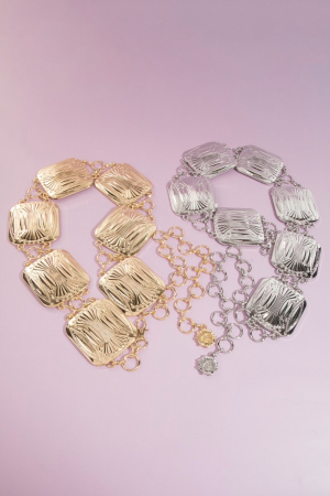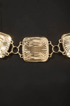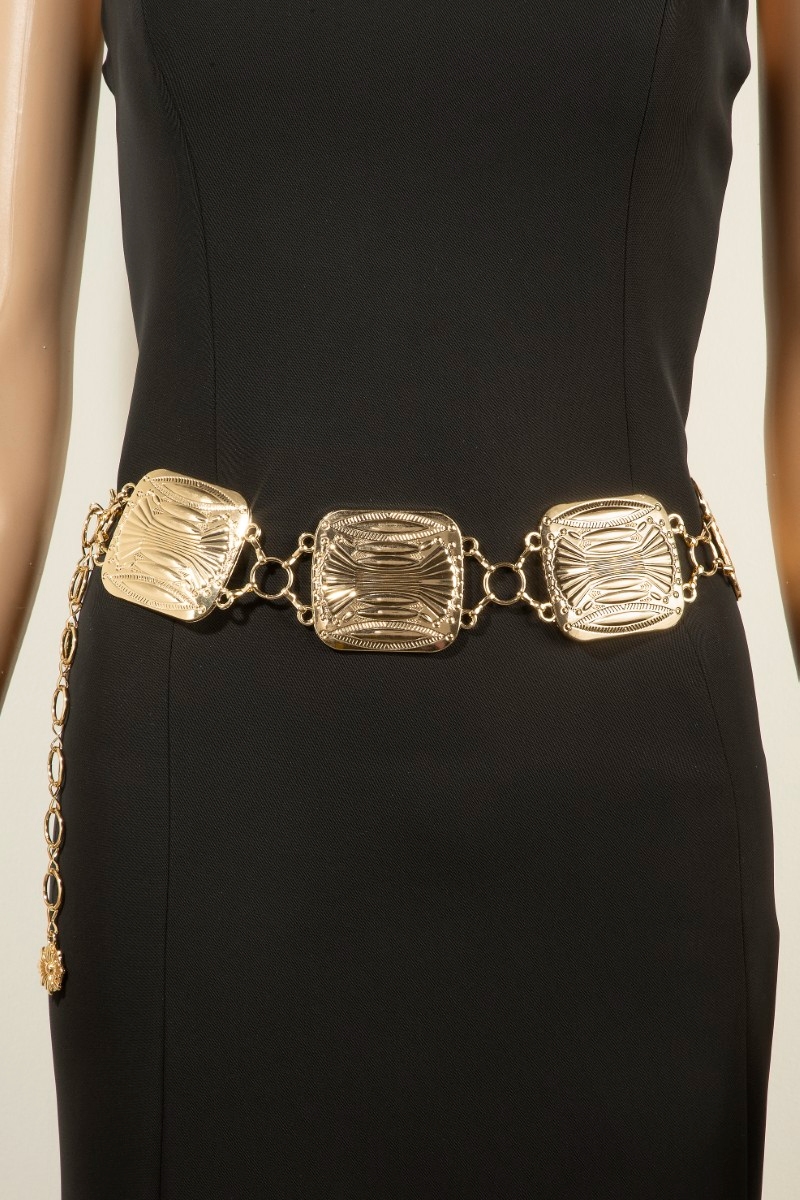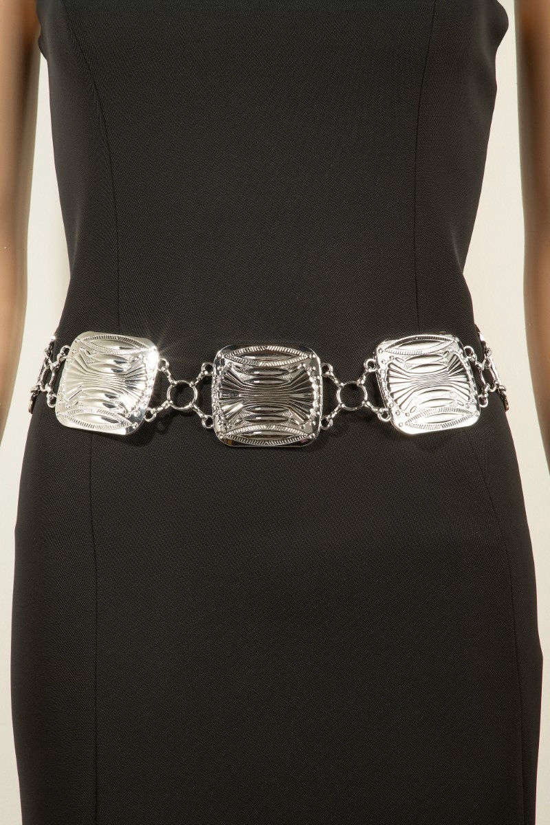 - This chain belt features a fashionable metallic western large square concho style. Celebrate individual style with this versatile, eye-catching addition.