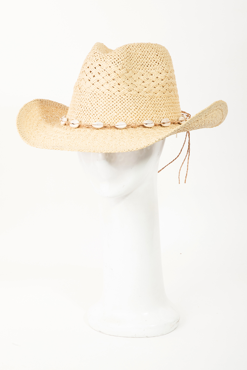 - This cowboy hat features a fashionable puka shell station ribbon style. Experience refined sophistication with this understated yet stylish piece.