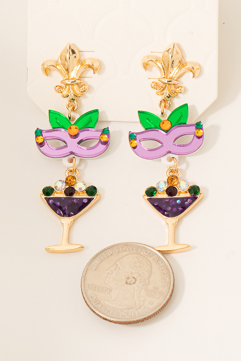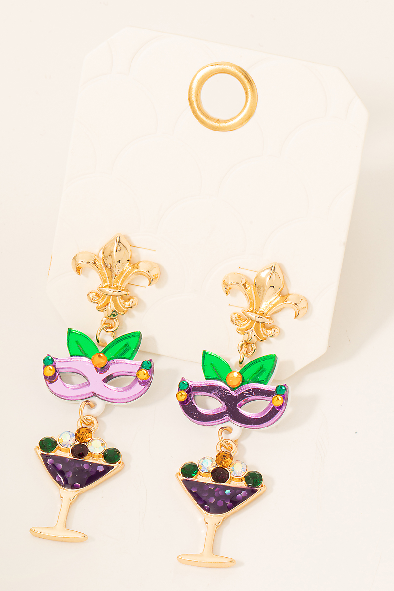• This pair of earrings showcases a unique mardi gras mask champagne style. Indulge in the artistry of accessorizing with this unique piece.