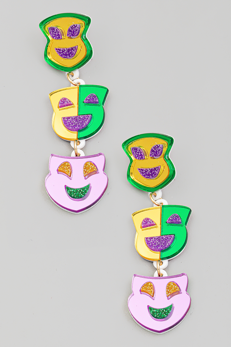 - This pair of dangle earrings features a fashionable mardi gras mirror masks chain style. Revel in the intricate design that effortlessly distinguishes this accessory, making it a statement piece.