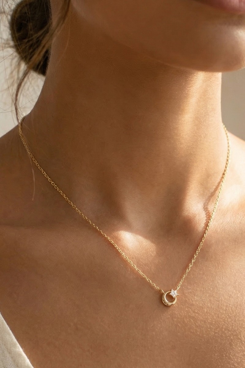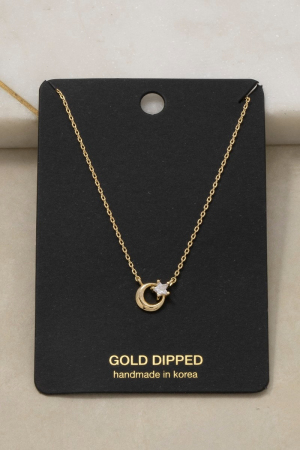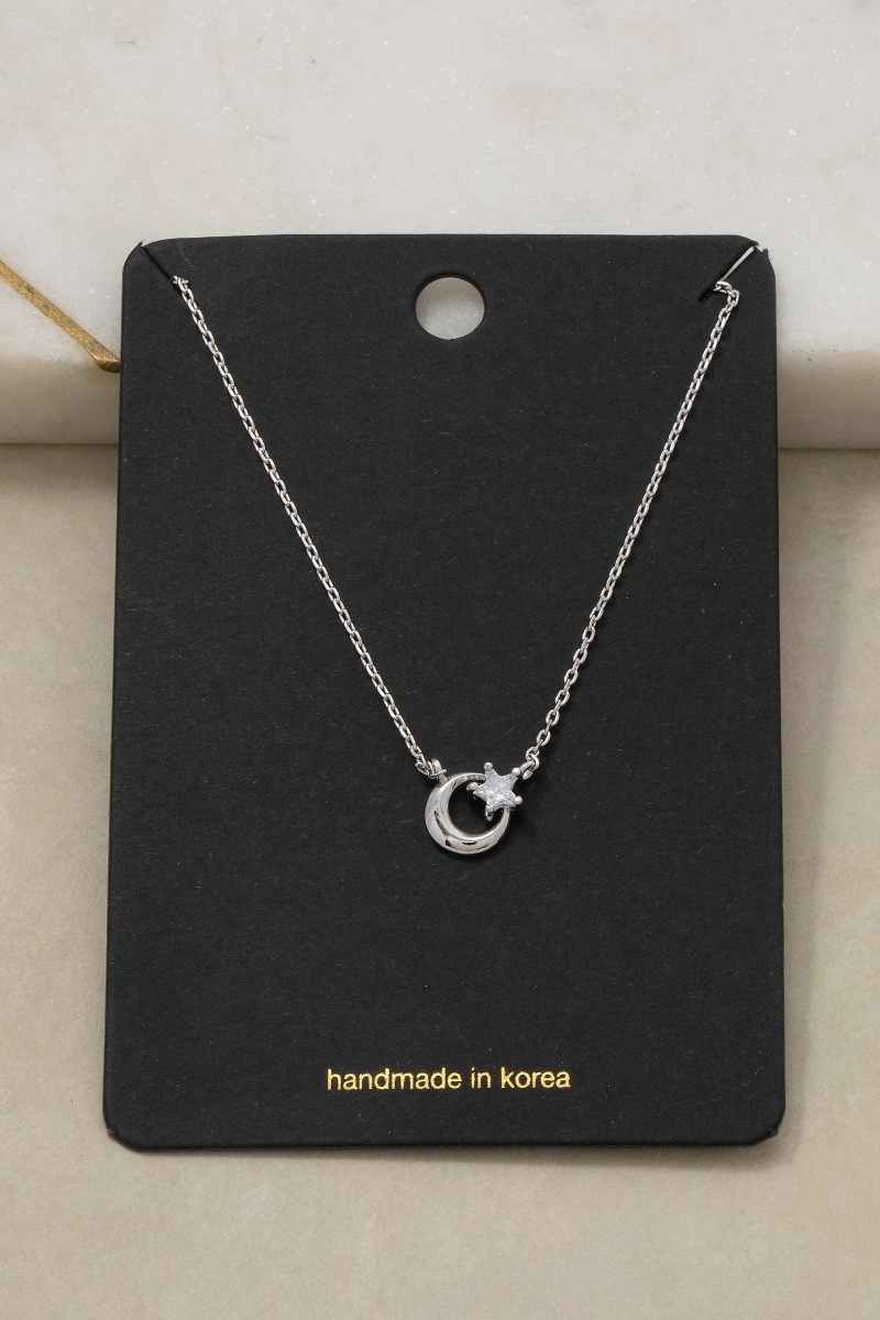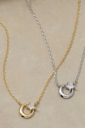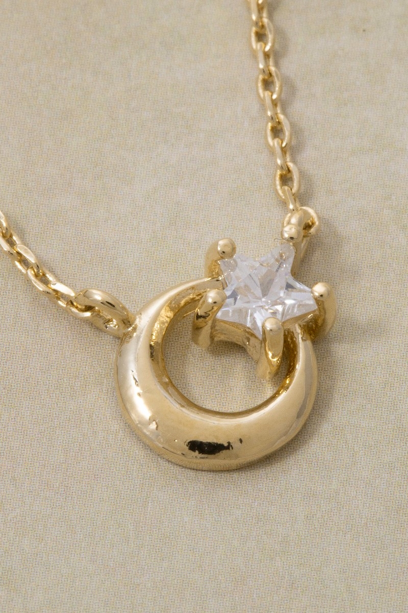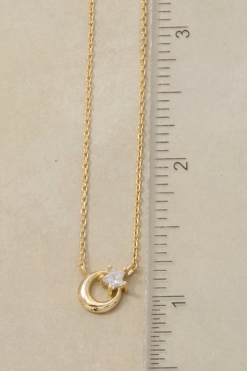 - This necklace showcases a timeless cz moon and star charm style. Indulge in the allure of exquisite craftsmanship as this necklace effortlessly adds a touch of luxury to your attire.