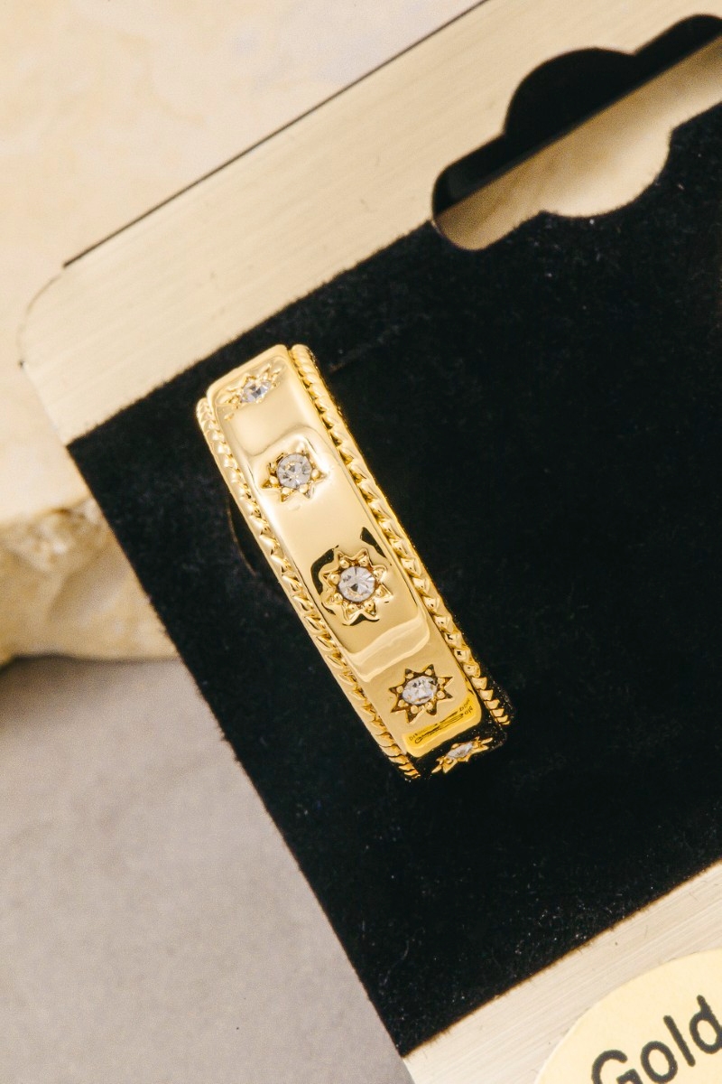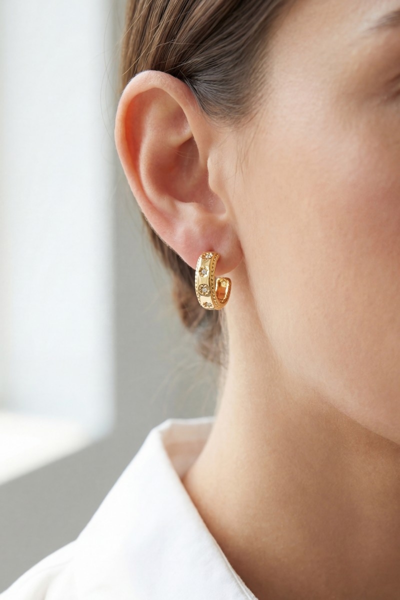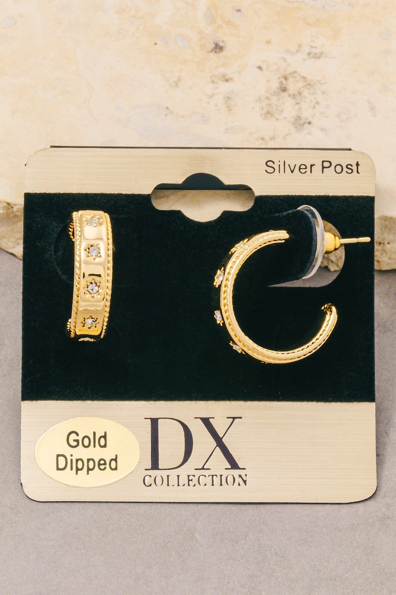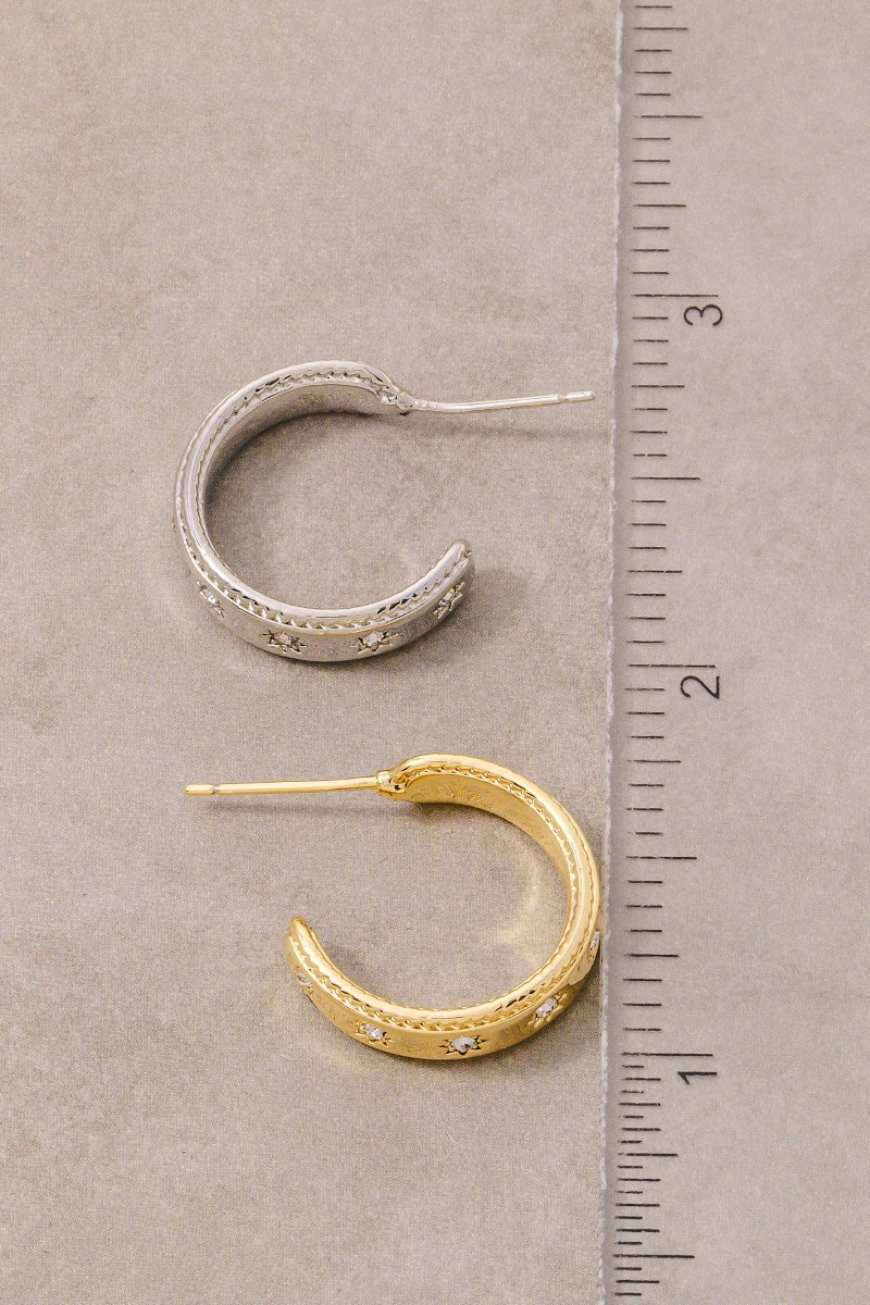 - This pair of hoop earrings showcases a timeless gold dipped cubic zirconia stars station style. Indulge in the artistry of accessorizing with this unique piece.