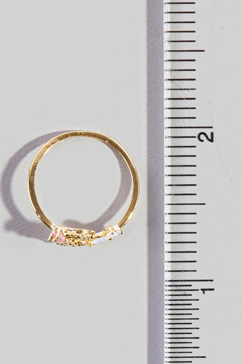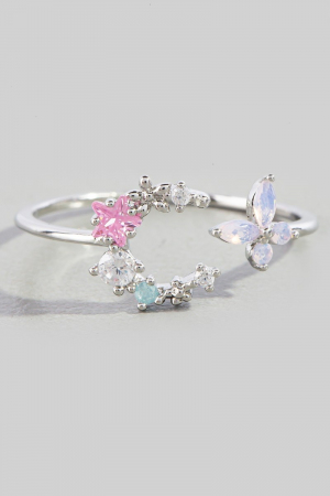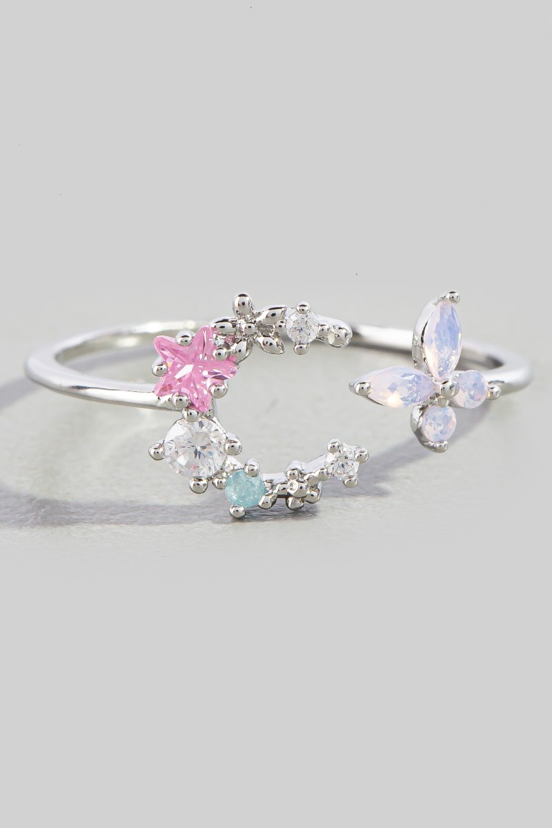 - This ring features a fashionable gold dipped cubic zirconia moon star and butterfly style. Immerse yourself in the world of understated glamour as this ring effortlessly exudes timeless appeal.