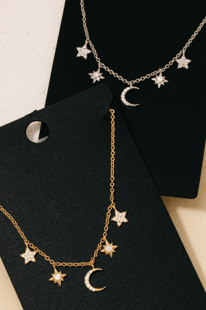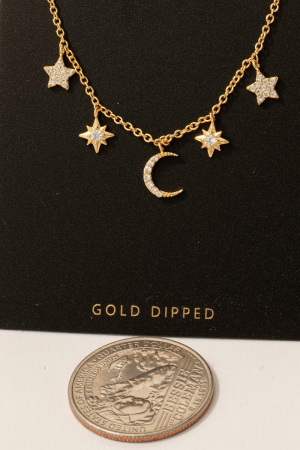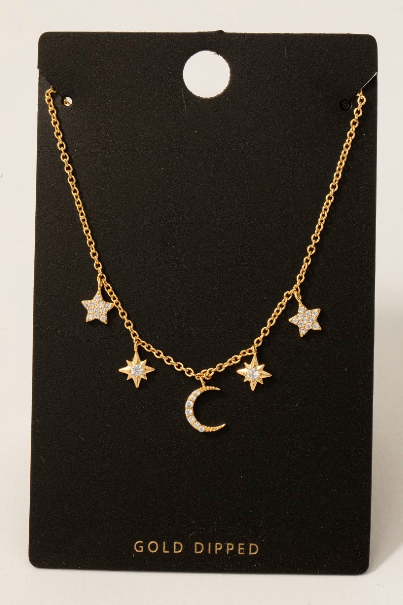 - This chain necklace brings a stunning gold dipped cubic zirconia pave star and moon charms style. Experience a burst of creativity in accessorizing as this piece effortlessly sets the tone for your unique style.