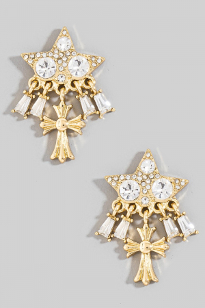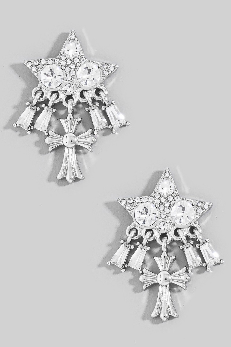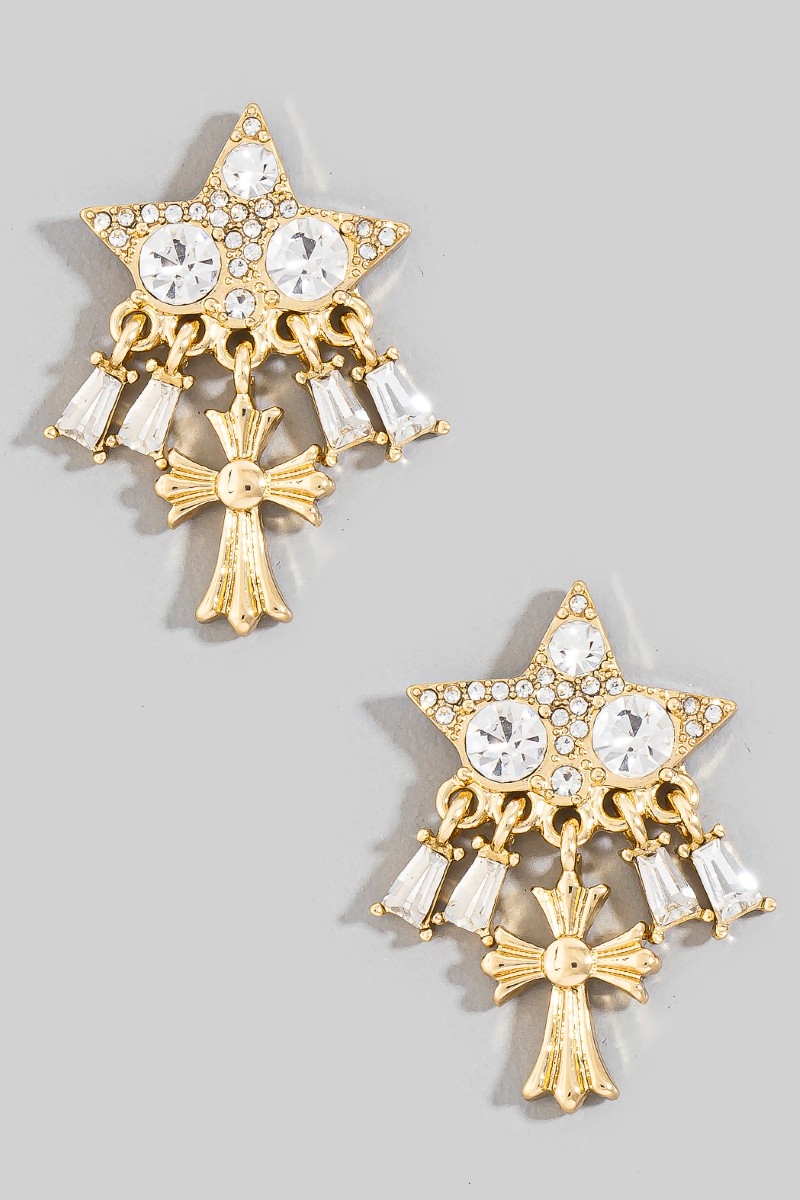 - This pair of stud earrings brings a stunning intricate pave baguette star and cross style. Witness the transformative power of accessories as this piece effortlessly redefines your fashion narrative.