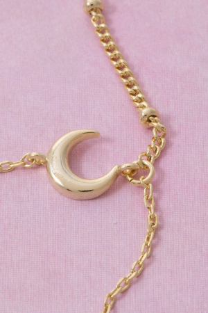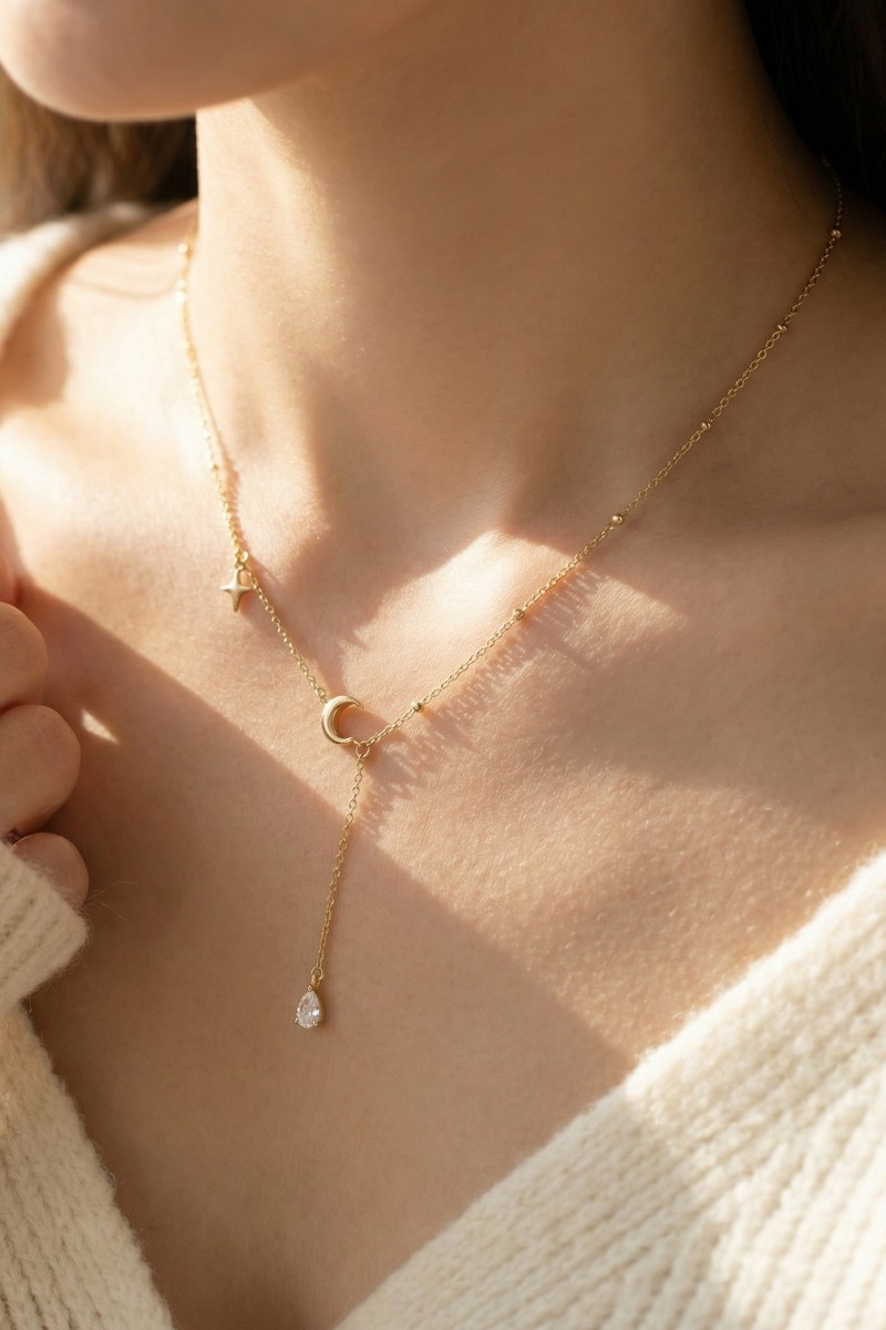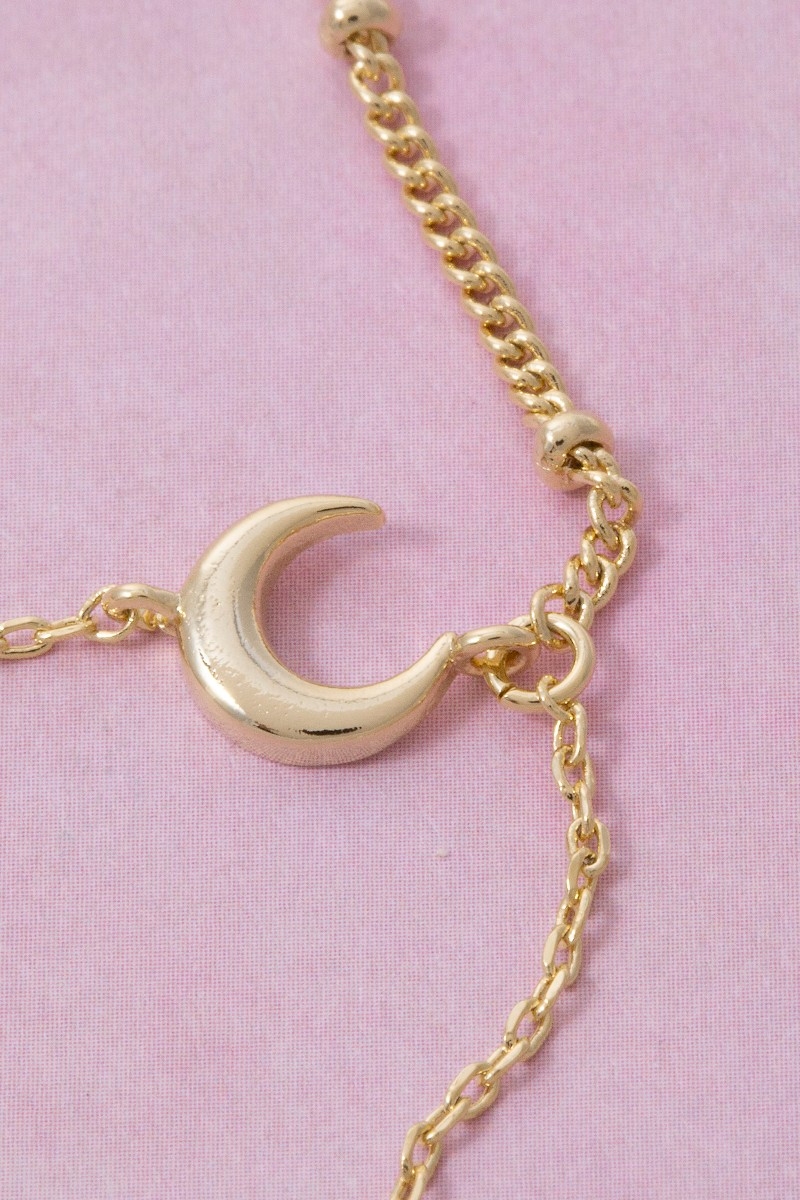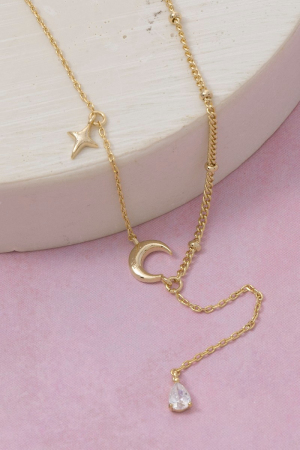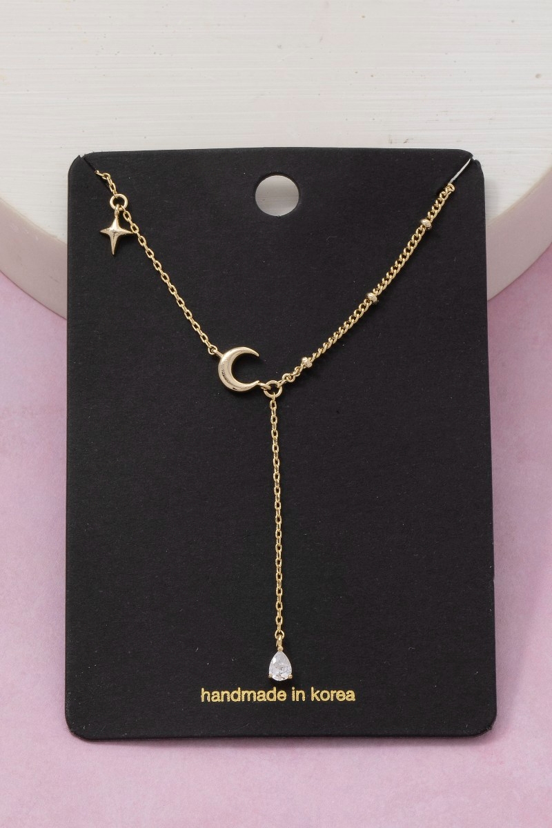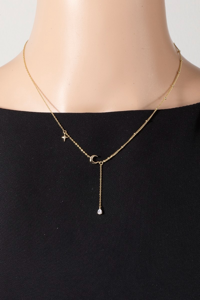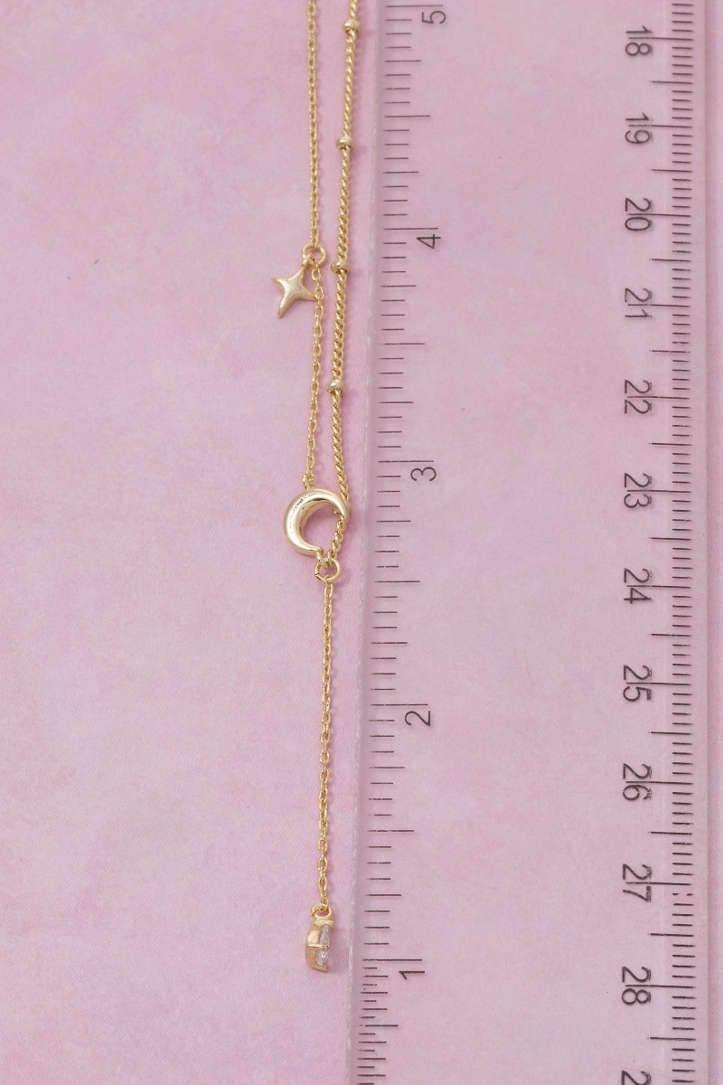 • This necklace adds a modern moon and star cubic zirconia charm y style. Elevate your ensemble with this necklace that effortlessly captures the essence of refined fashion.