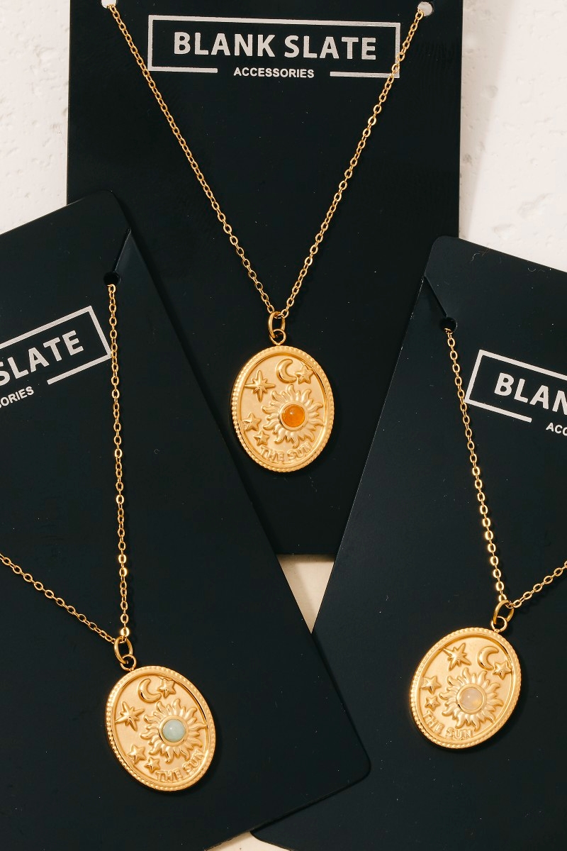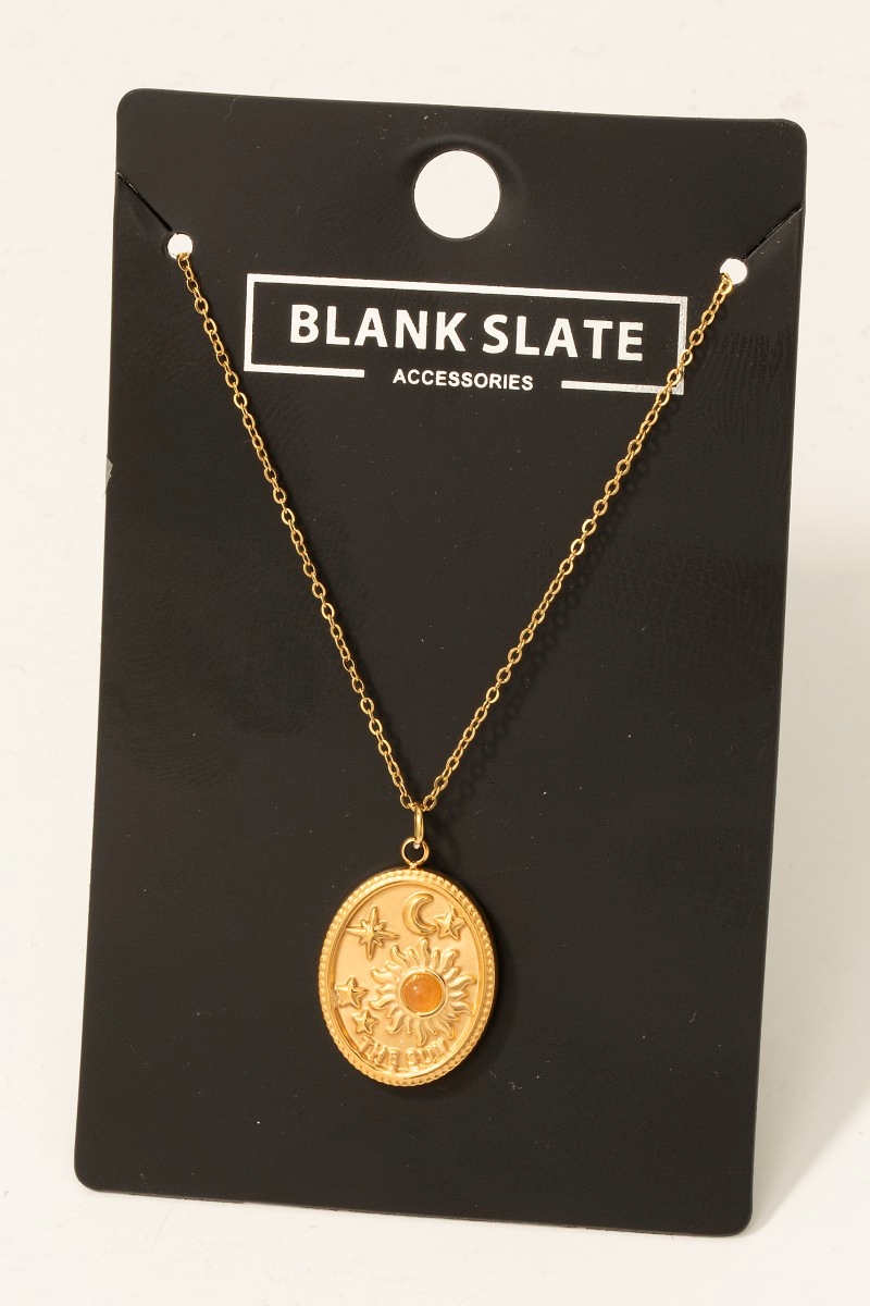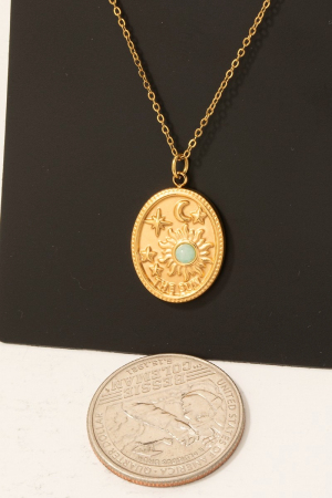 - This necklace brings a luxurious stainless steel sun moon and stars oval pendant style. Celebrate individuality with this necklace that effortlessly expresses your unique sense of style.