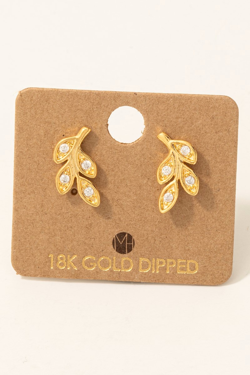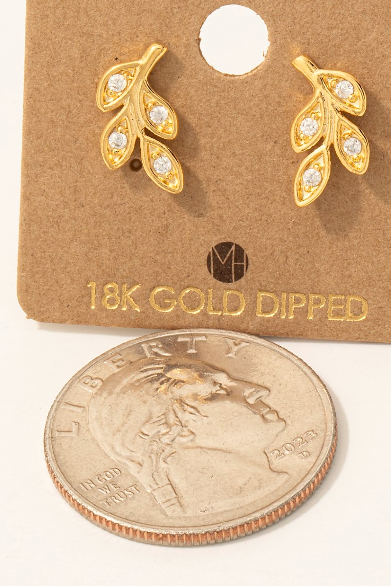• This pair of stud earrings introduces a unique gold dipped cubic zirconia leaves style. Celebrate the art of accessorizing with this piece that effortlessly encapsulates modern trends.