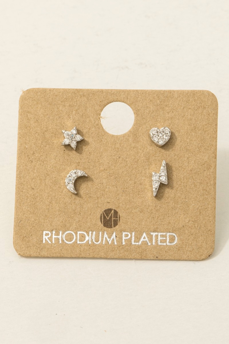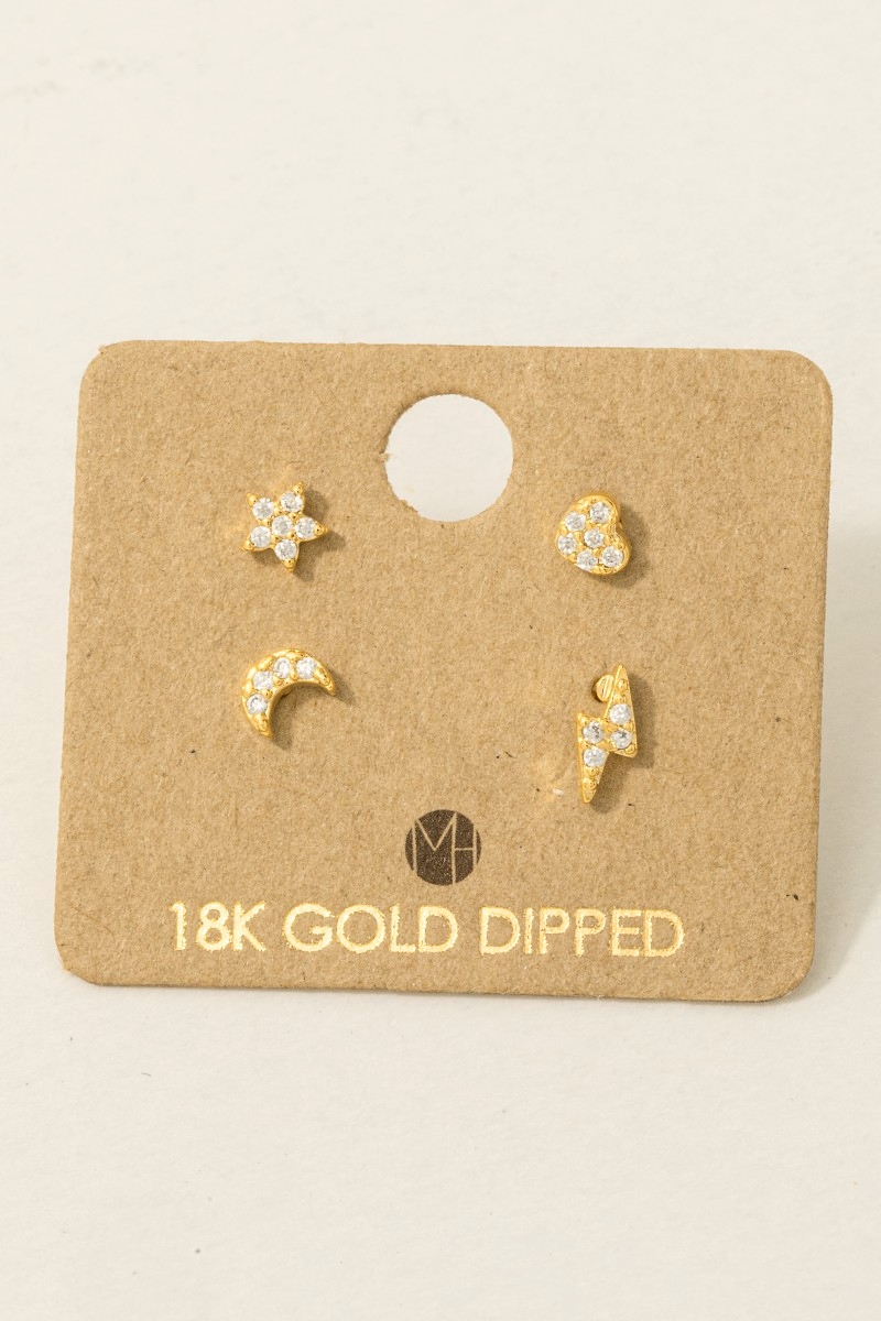 • This trending pair of earrings showcases a timeless gold dipped mini star lightning heart moon stud earrings set style. Immerse yourself in fashion finesse with this statement trending pair of earrings.
