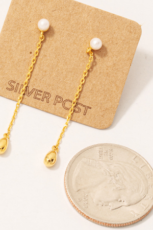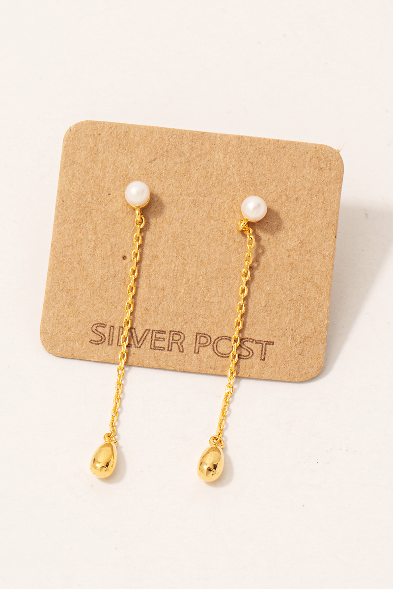 - This pair of dangle earrings displays a fashionable gold dipped tear and pearl stud chain style. Indulge in the allure of exquisite craftsmanship as this pair of dangle earrings effortlessly adds a touch of luxury to your attire.
