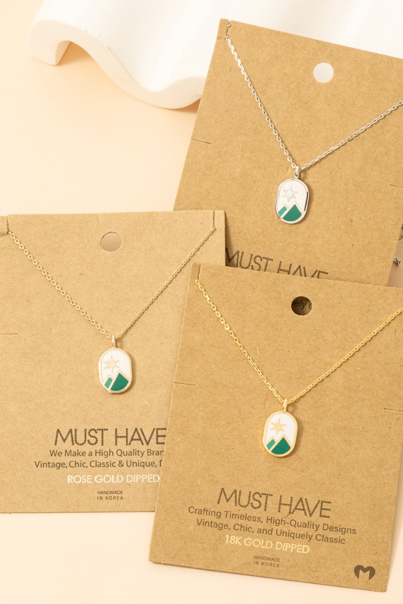 - This trending necklace introduces a stunning gold dipped oval mountain range coin charm necklace style. Explore a blend of classic charm and contemporary flair.