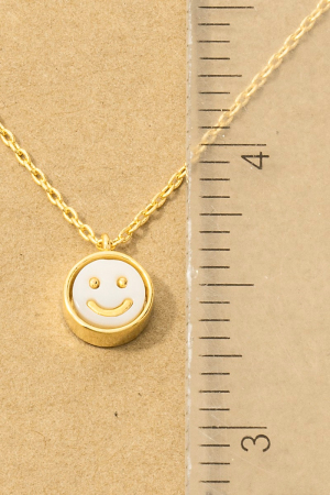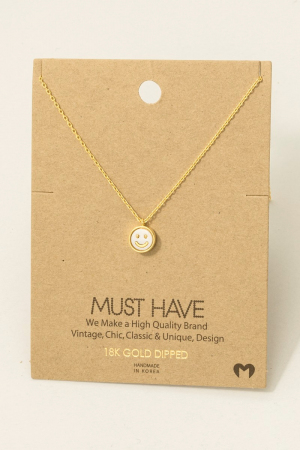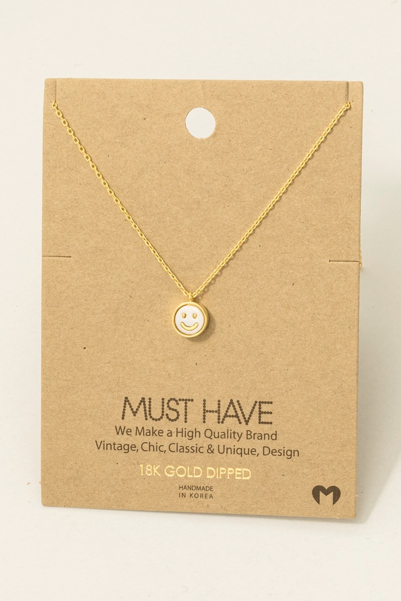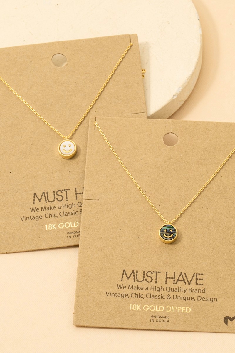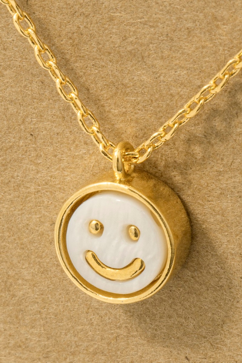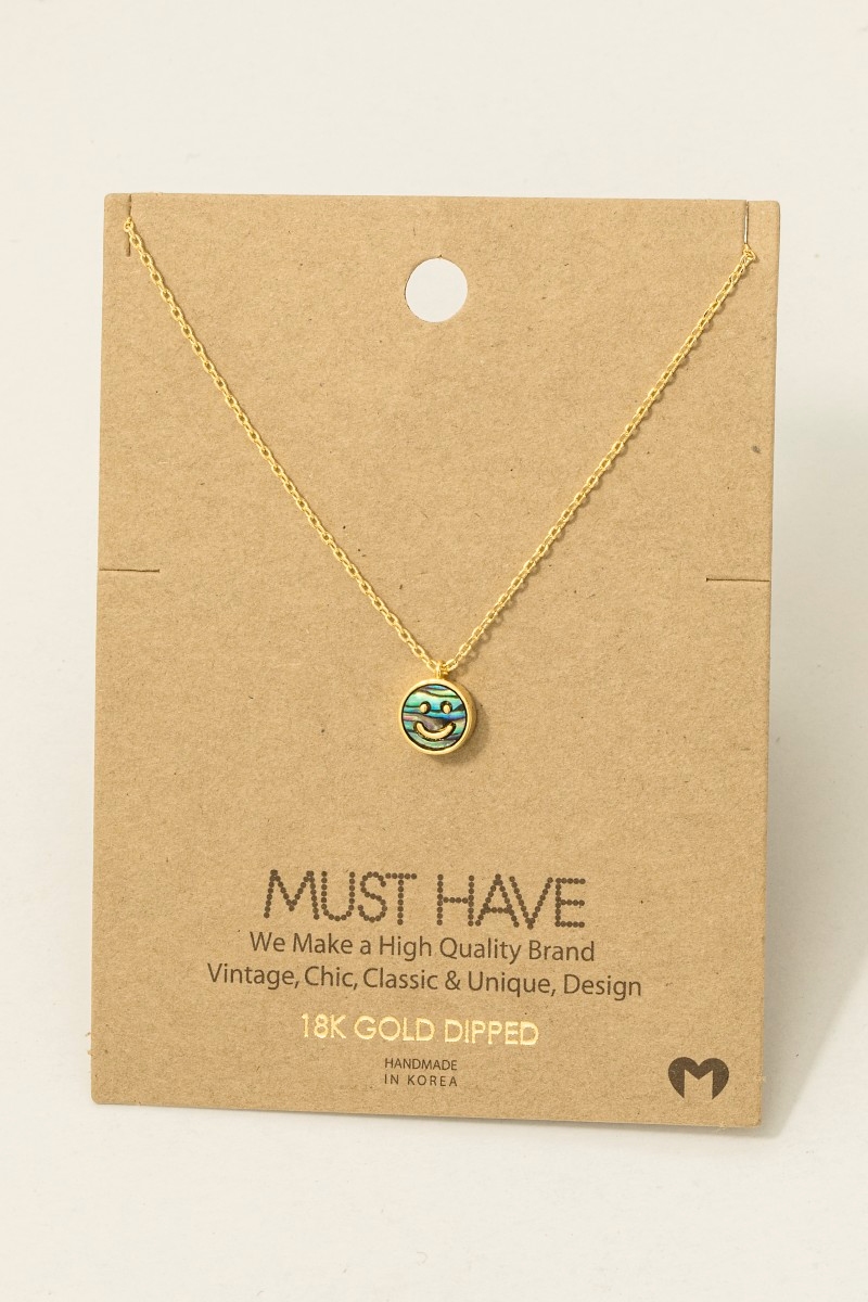 • This trending necklace displays a vibrant gold dipped shell smiley face pendant necklace style. Elevate your ensemble with this chic, timeless trending necklace.