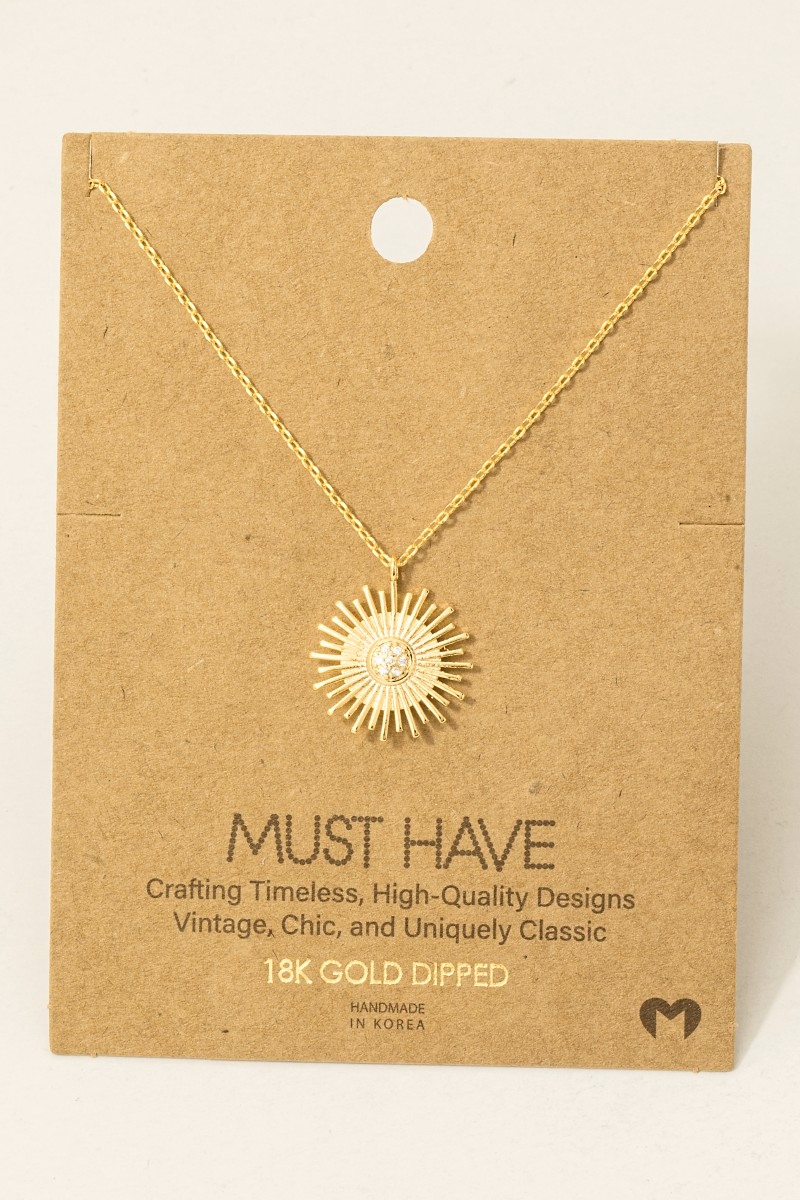 • This trending necklace showcases a timeless circle sun shine ray pendant necklace style. Elevate your ensemble with this chic, timeless trending necklace.
