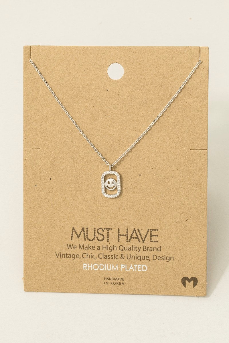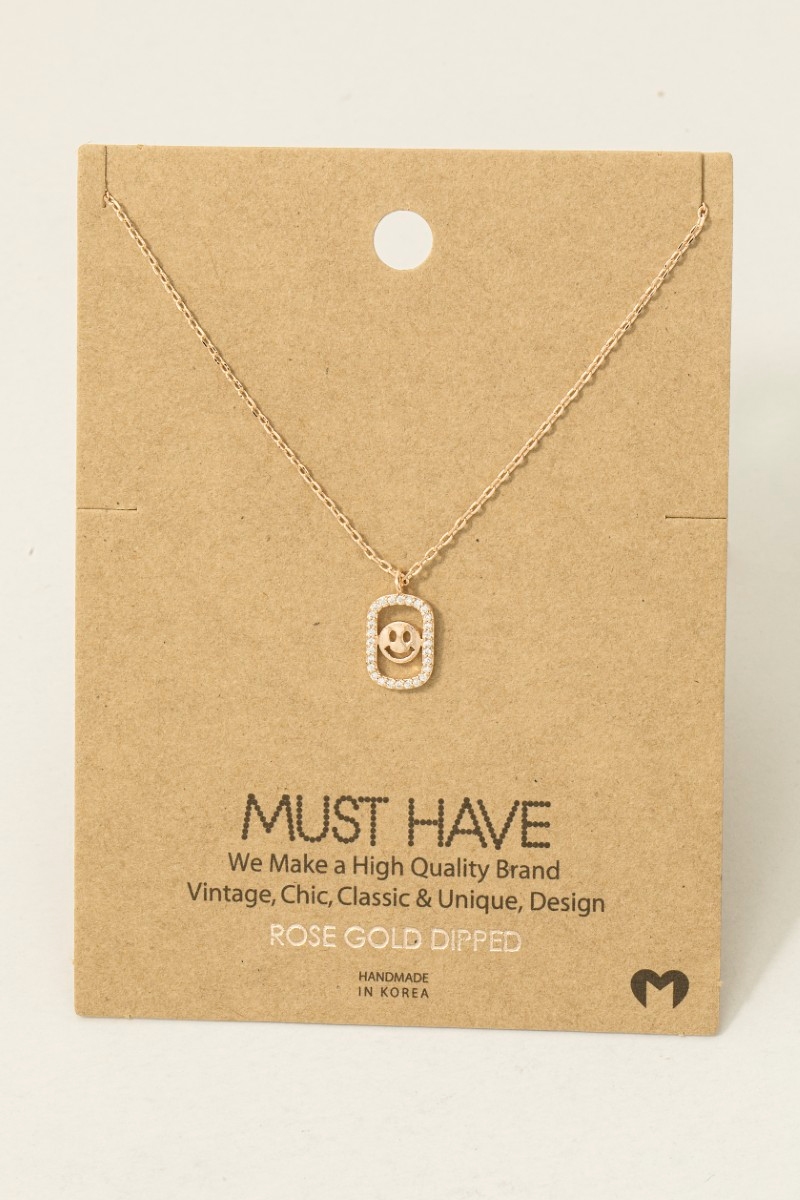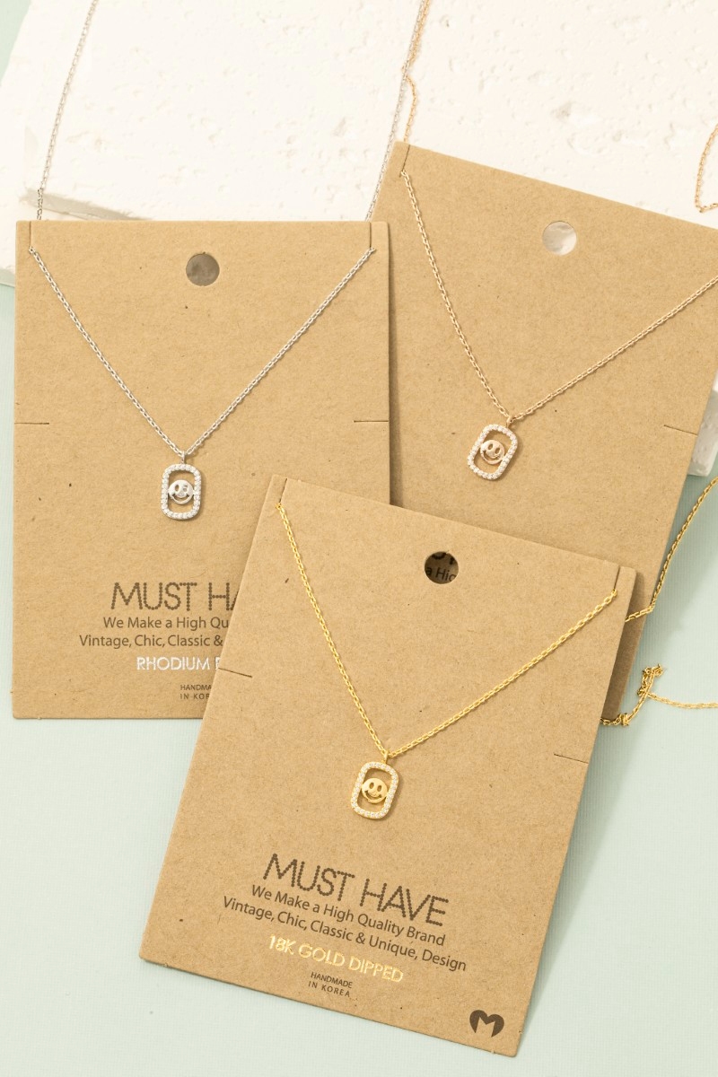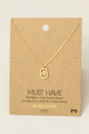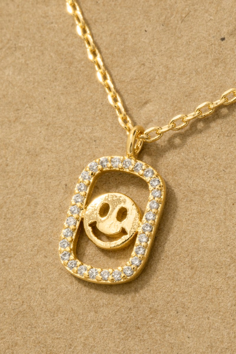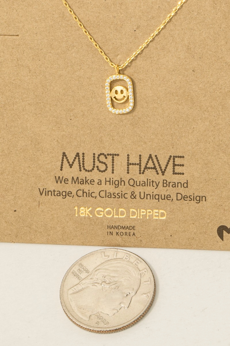 • This necklace adds a modern gold dipped cubic zirconia halo set smiley face pendant style. Celebrate individuality with this necklace that effortlessly expresses your unique sense of style.
