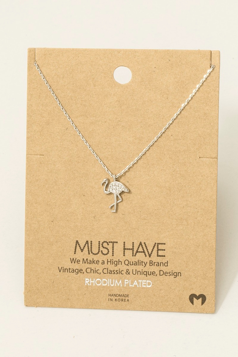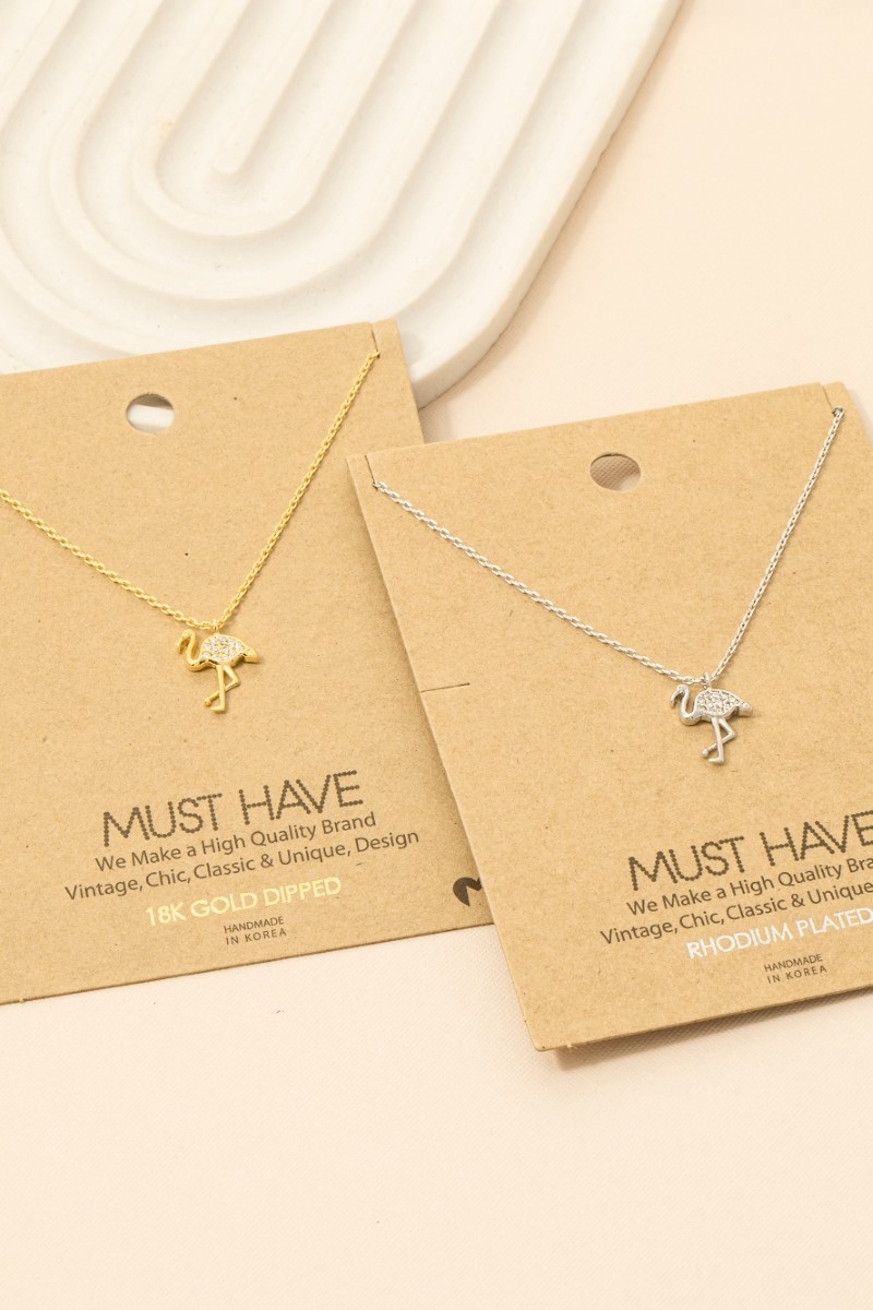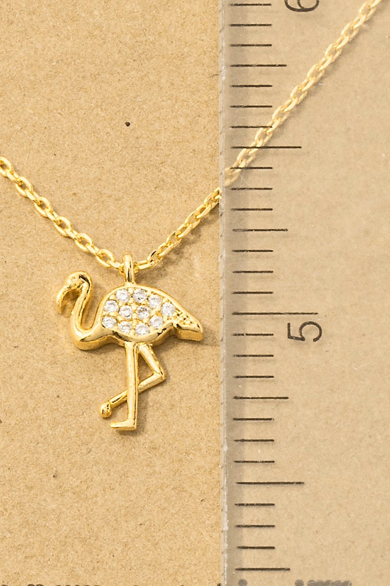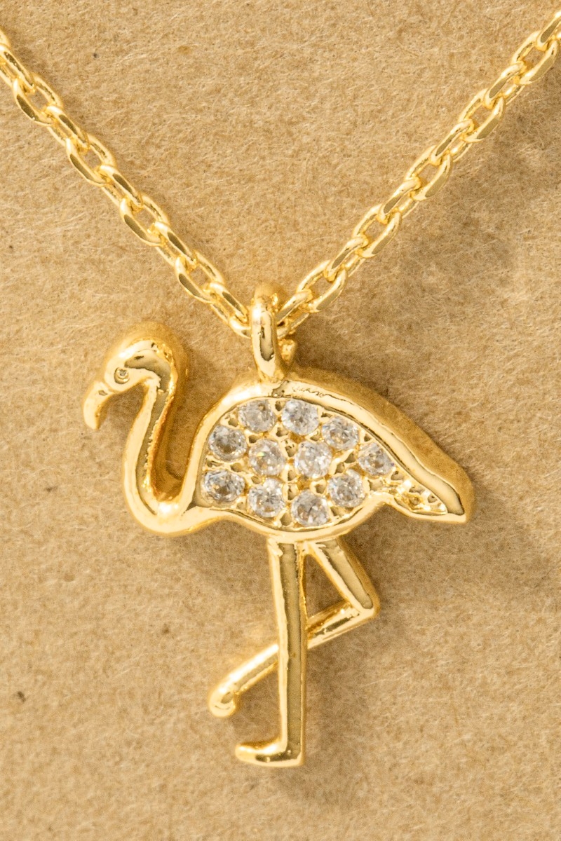 • This trending necklace showcases a unique gold dipped cubic zirconia pave flamingo pendant necklace style. Experience a subtle blend of modernity and classic charm as this trending necklace effortlessly adorns your ensemble.