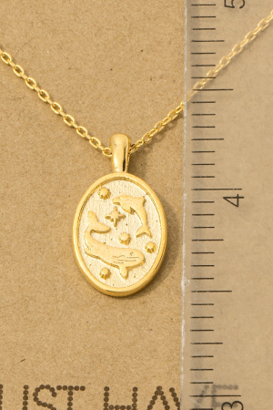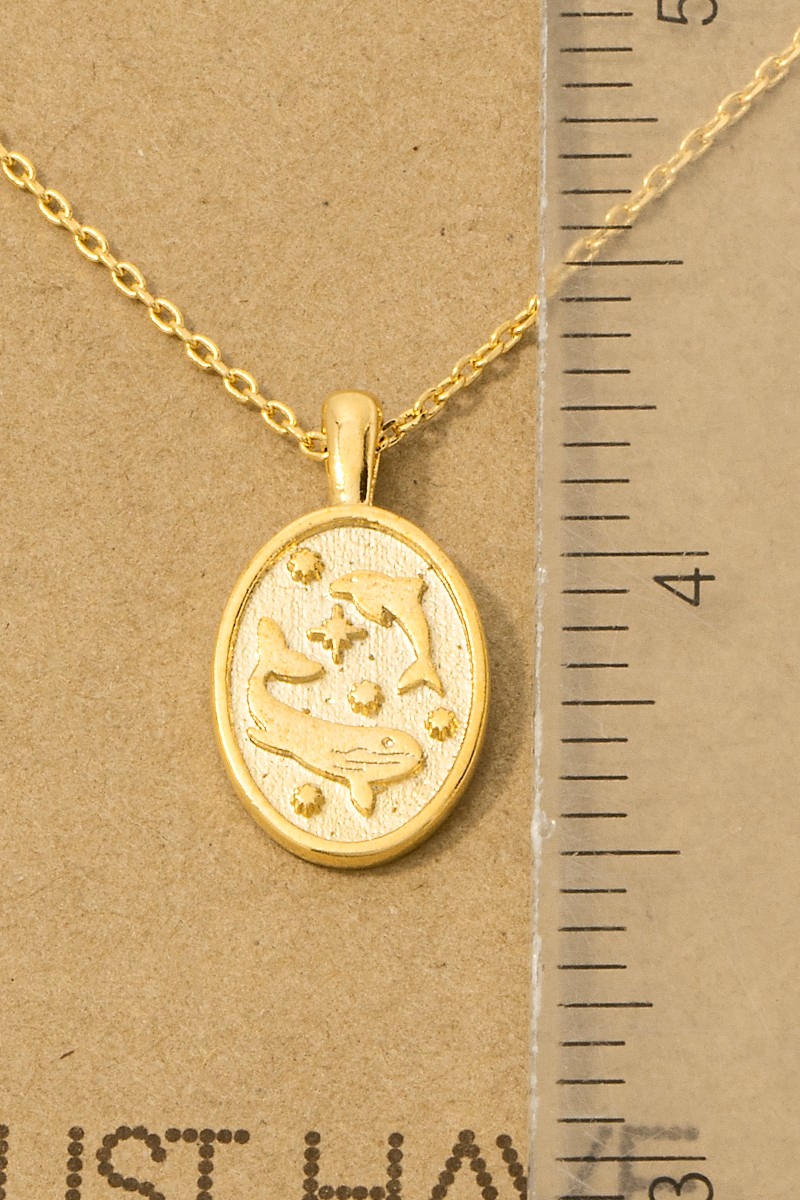 • This trending necklace showcases a timeless gold dipped dolphin and whale oval pendant necklace style. Immerse yourself in the world of understated glamour as this trending necklace effortlessly exudes timeless appeal.