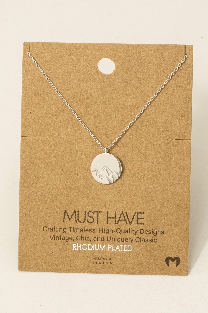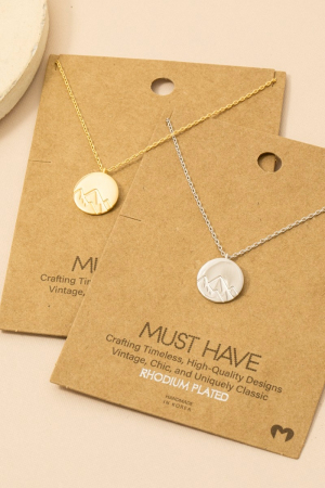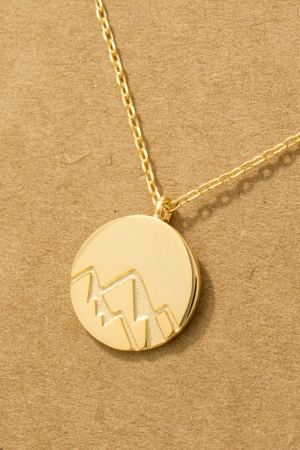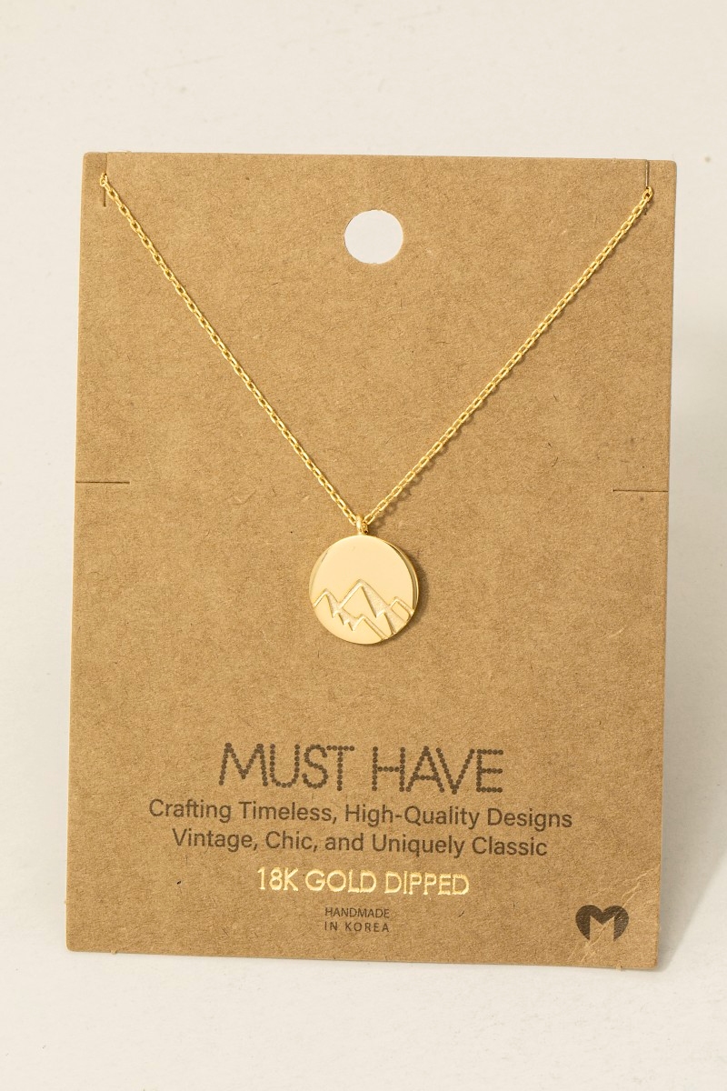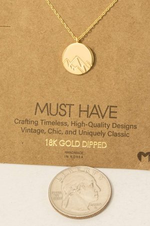 - This trending necklace displays a vibrant gold dipped etched mountain coin pendant necklace style. Immerse yourself in the world of understated glamour as this trending necklace effortlessly exudes timeless appeal.