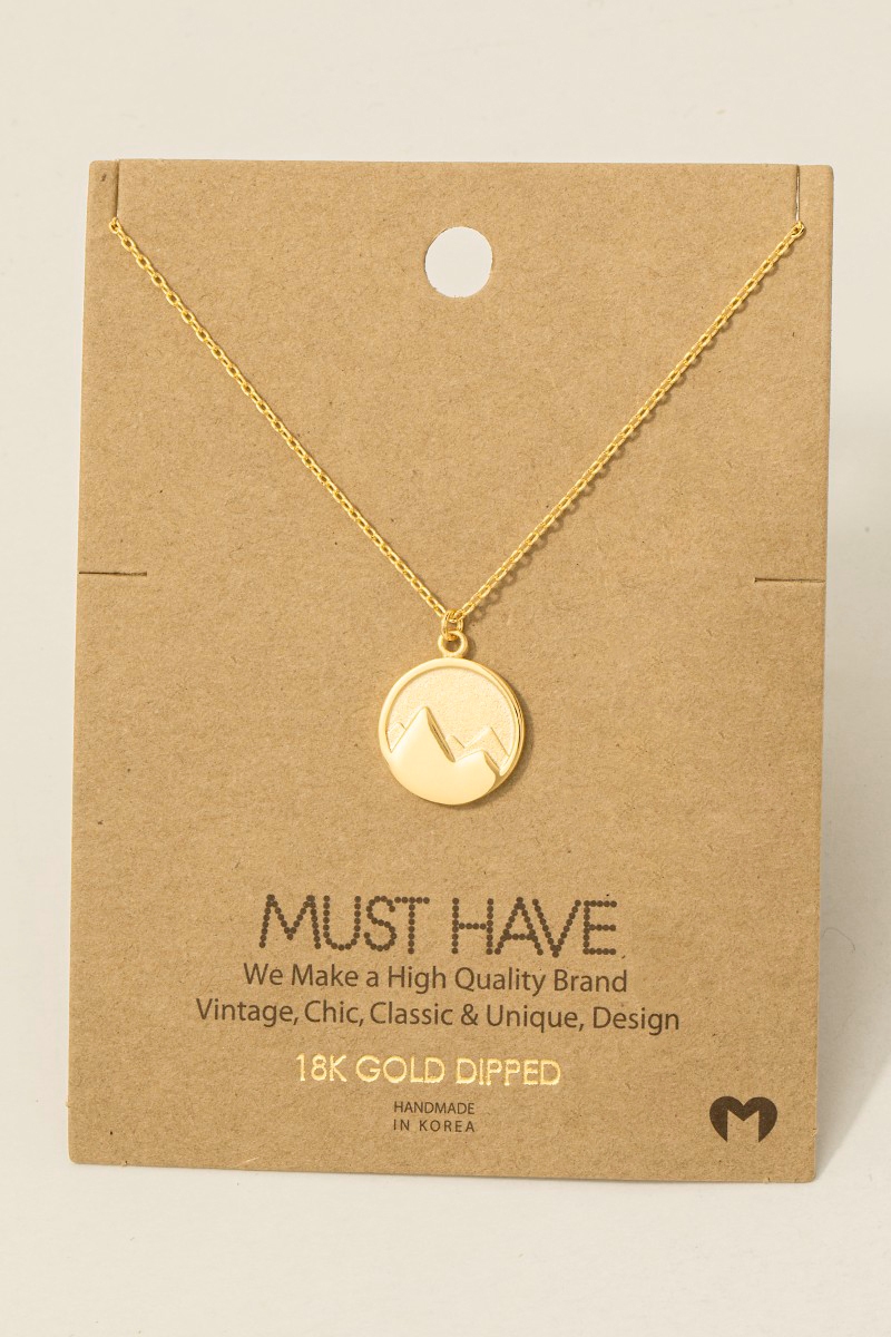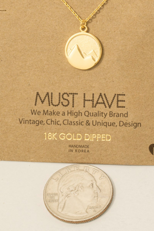 - This trending necklace features a fashionable gold dipped mountain coin pendant necklace style. Redefine your look effortlessly with this standout, on-trend piece.
