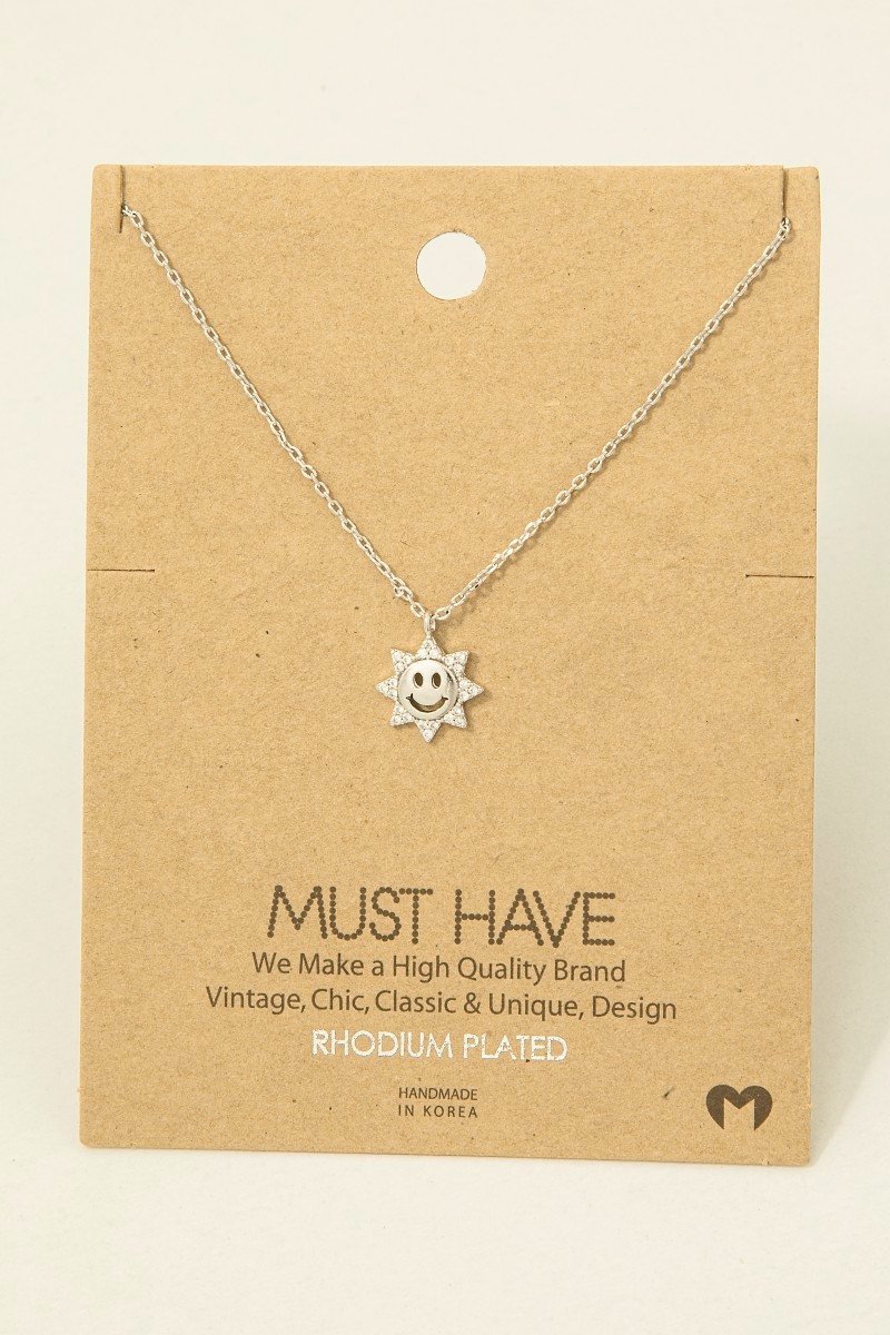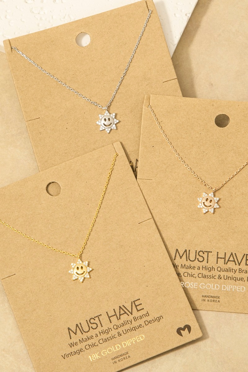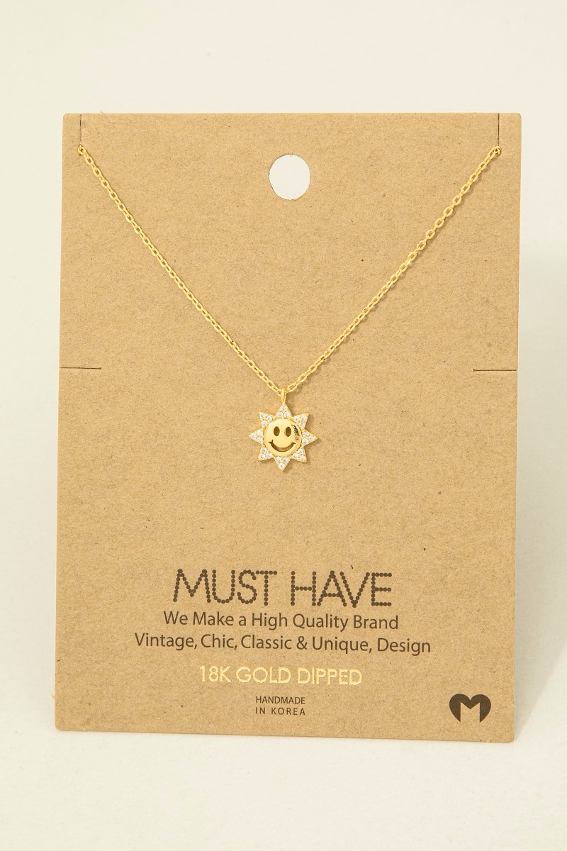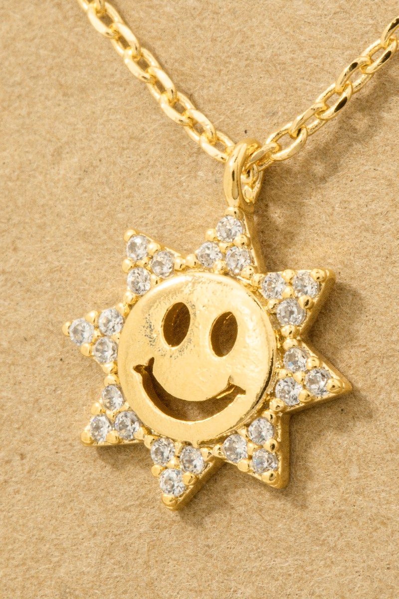- This trending necklace displays a fashionable gold dipped pave cubic zirconia smiley sun pendant necklace style. Experience a subtle blend of modernity and classic charm as this trending necklace effortlessly adorns your ensemble.