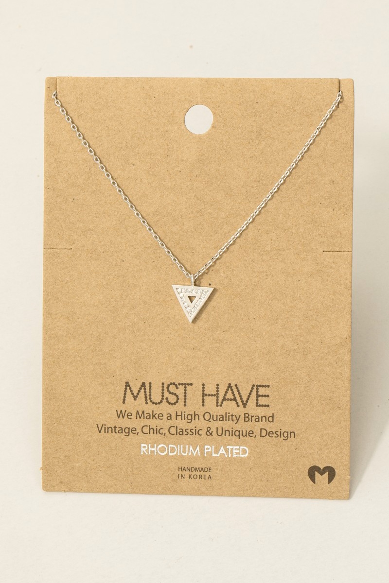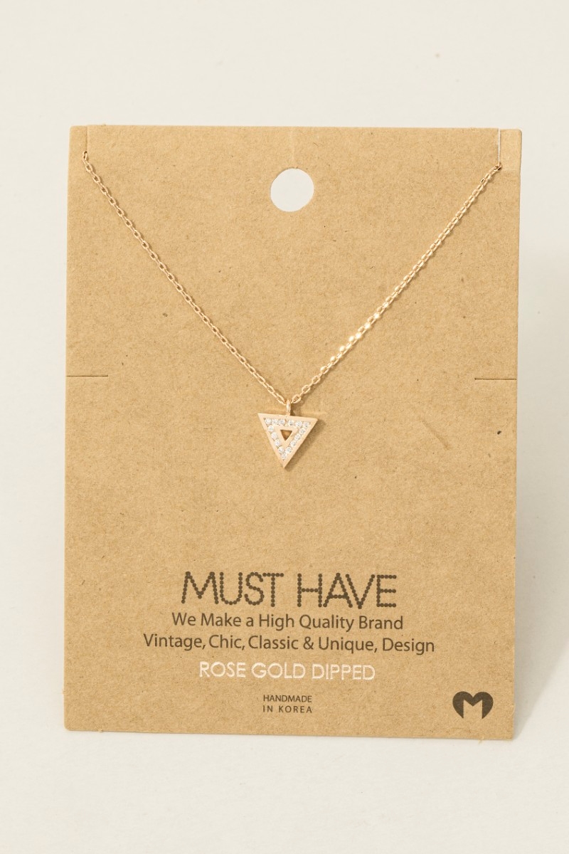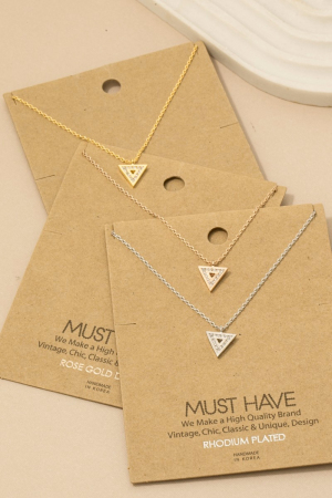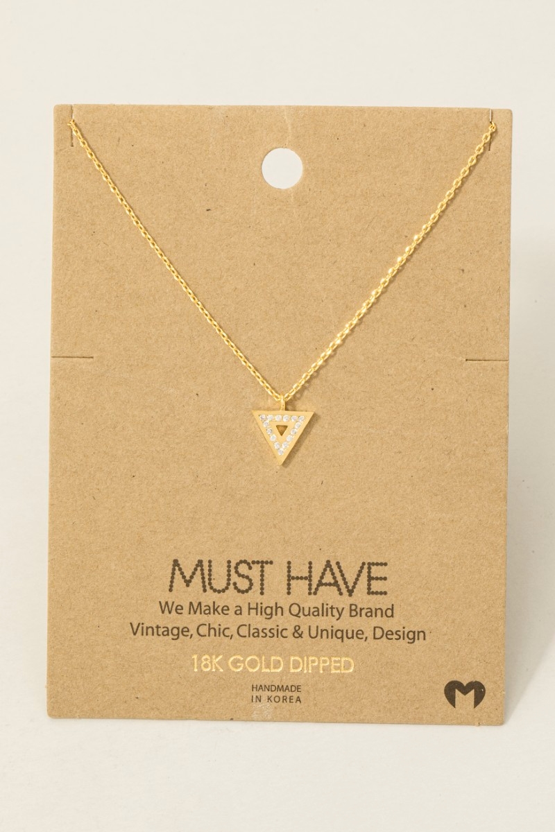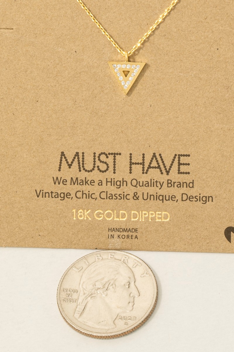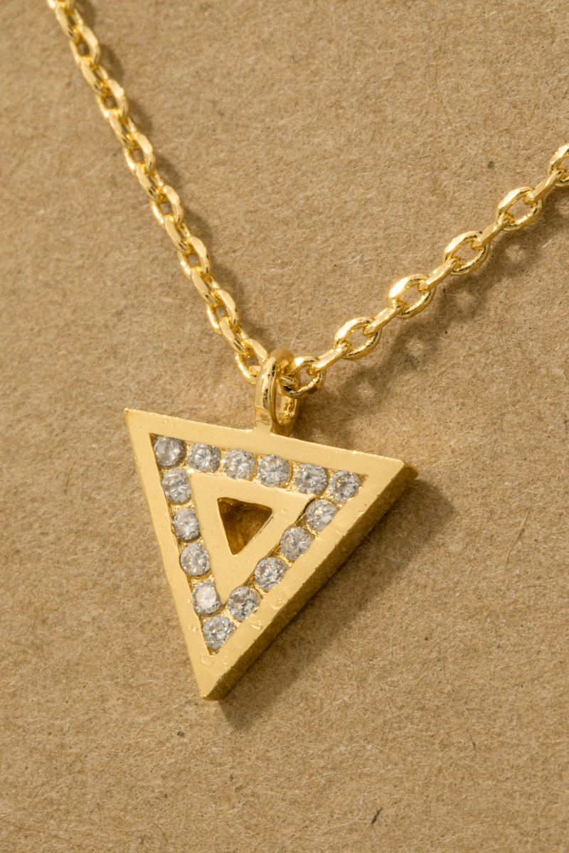 • This trending necklace displays a fashionable gold dipped pave triangle pendant necklace style. Indulge in the artistry of accessorizing with this unique piece.