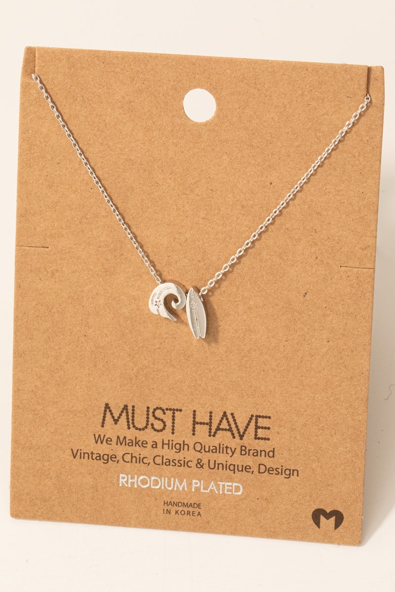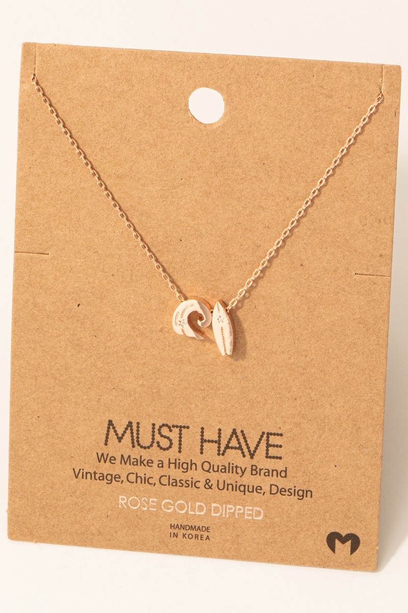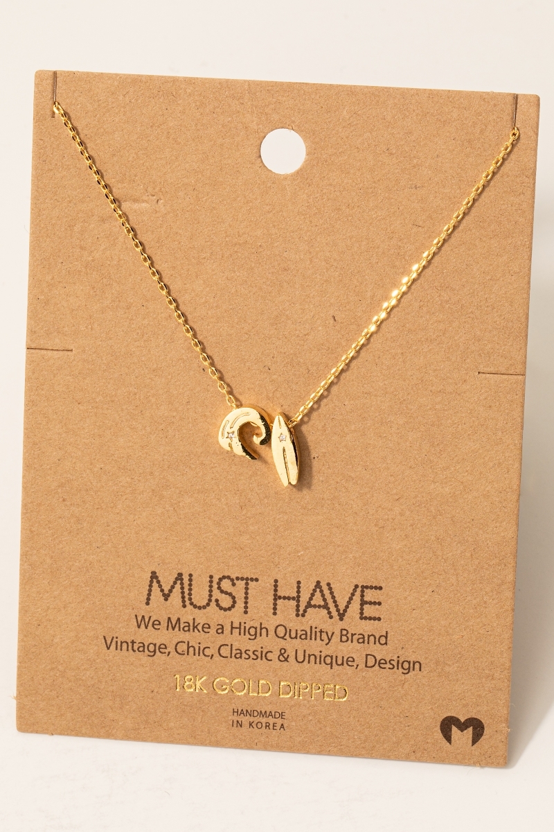 - This necklace brings a stunning gold dipped surfboard and wave charms style. Elevate your ensemble with this necklace that effortlessly captures the essence of refined fashion.